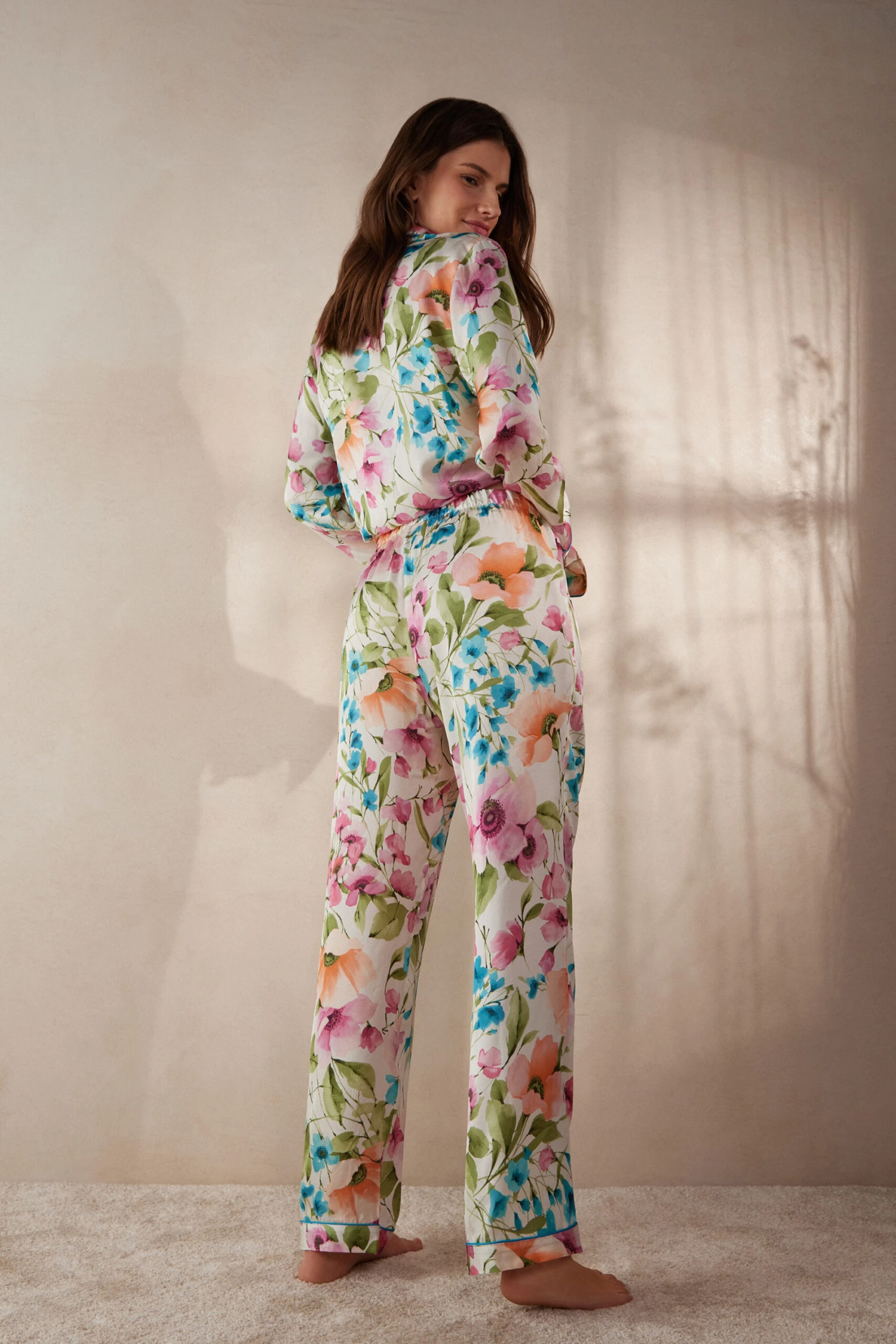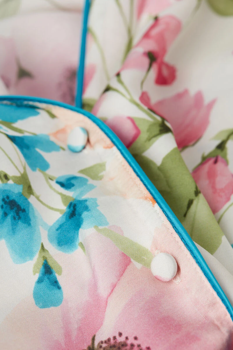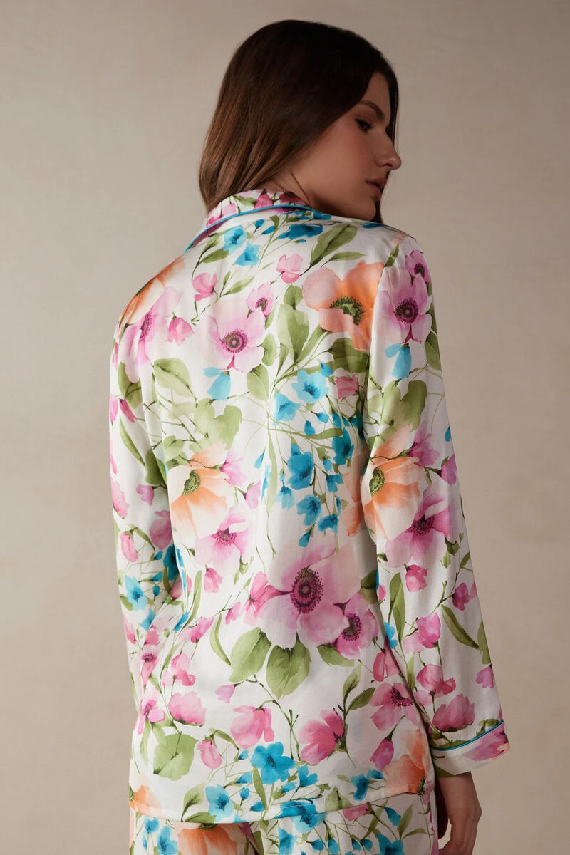 Menswear style multicolour floral-print viscose satin top with long sleeves. Contrasting trim and neck and cuffs. Regular fit.