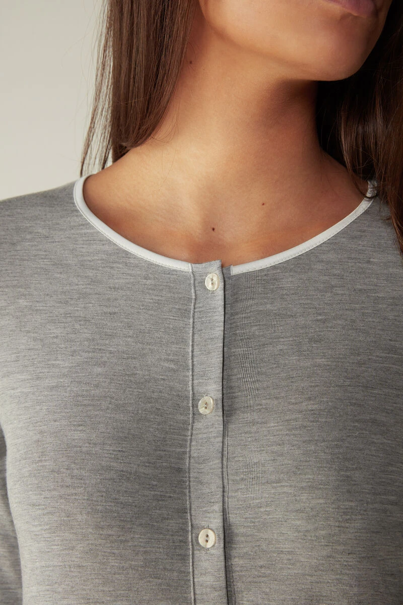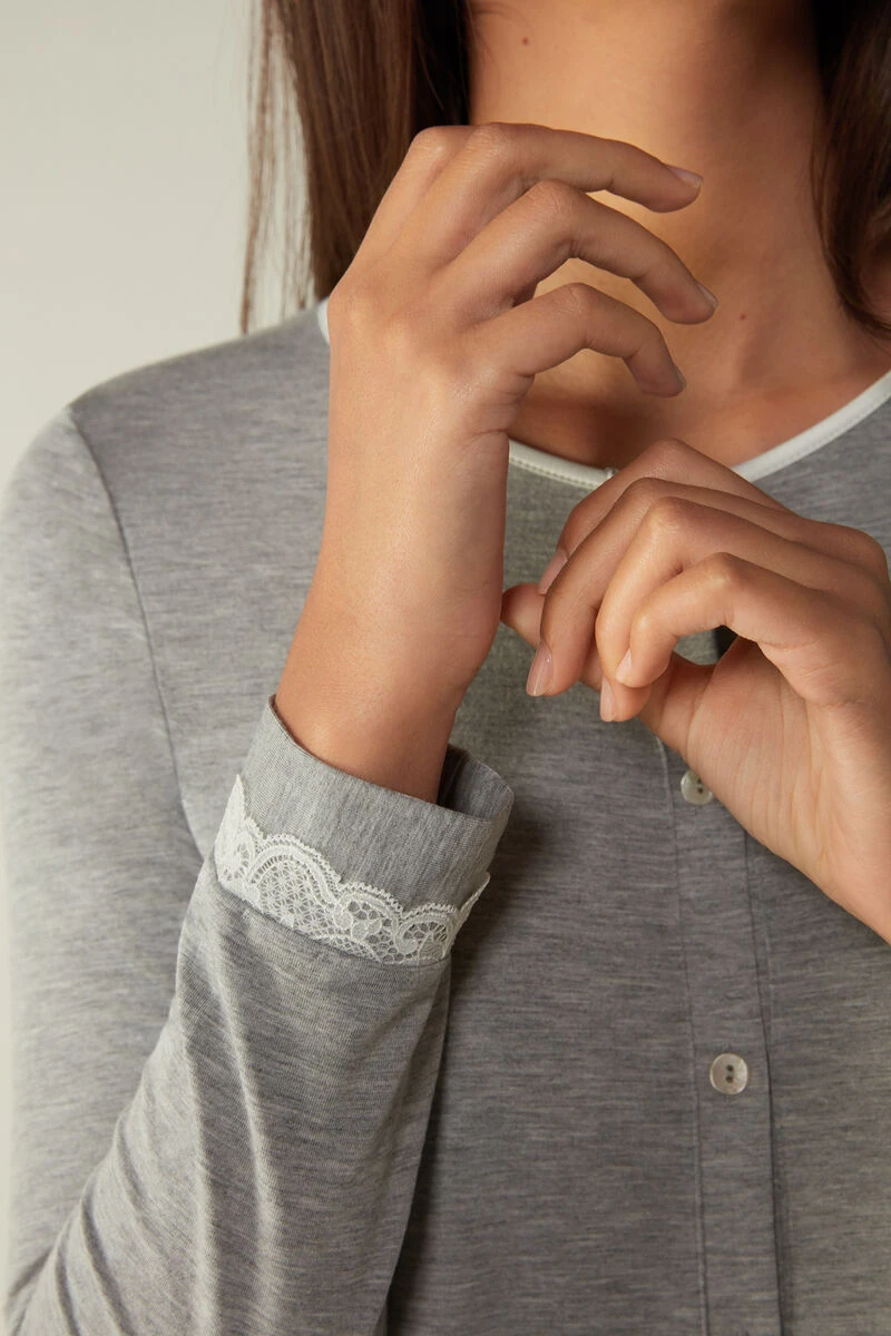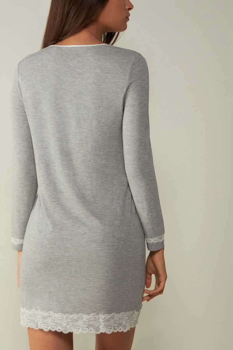 Long-sleeve round-neck button-front nightdress in stretch micromodal. Featuring lace details on the cuffs and hem. The model is 179 cm tall and wears size S.