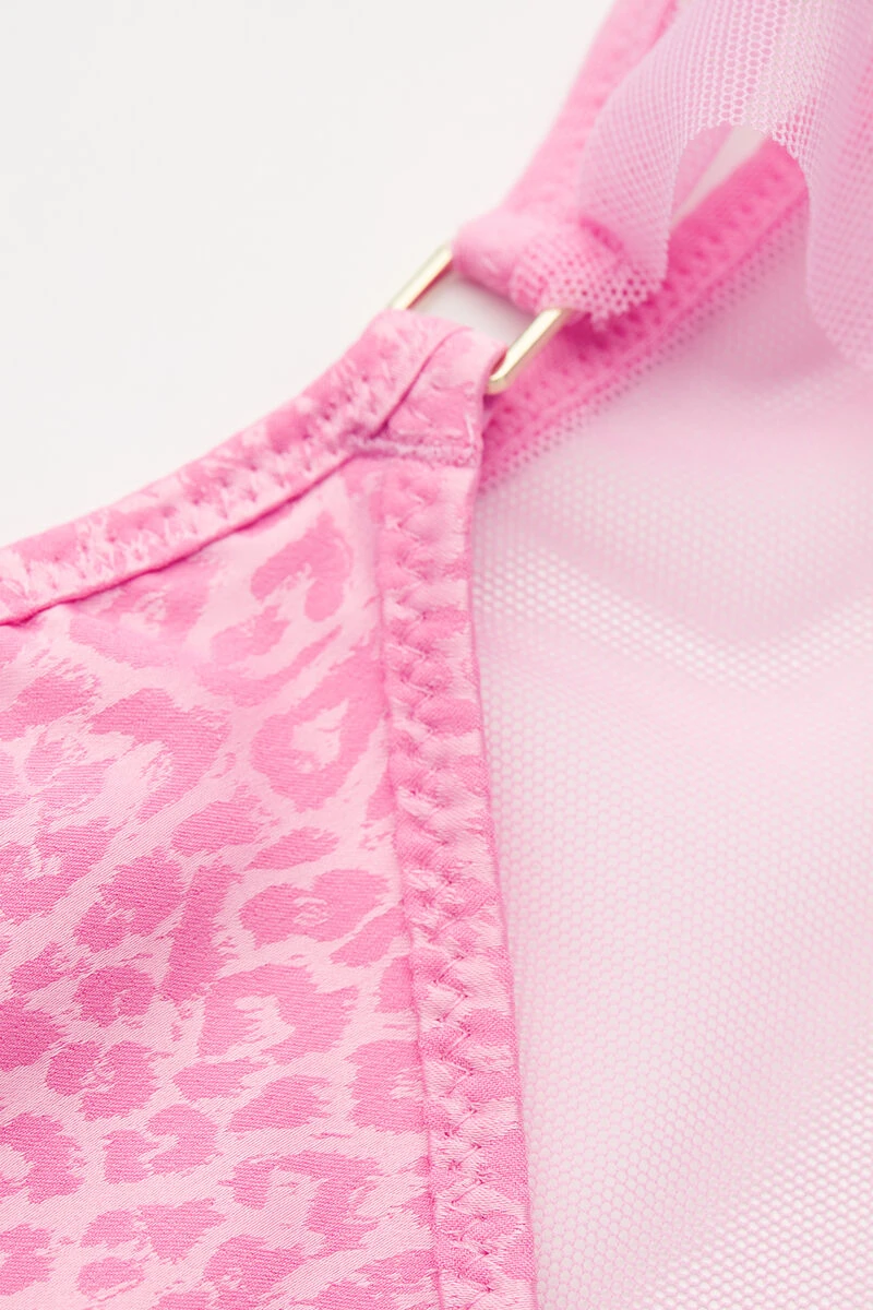 Brazilian briefs made of animal-pattern jacquard satin with sides and back in soft raw-cut tulle. Square jewel accessories. 100% cotton gusset.