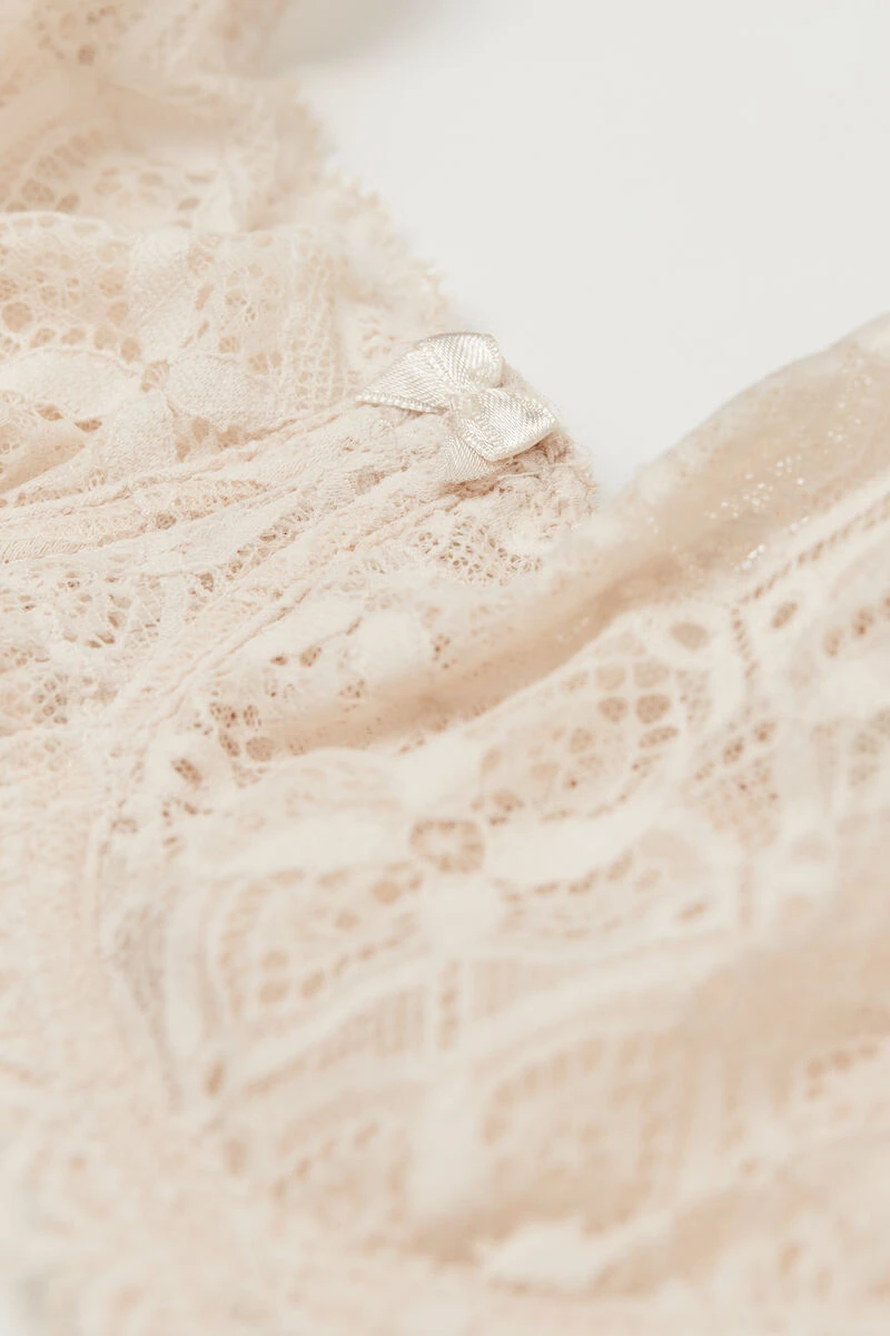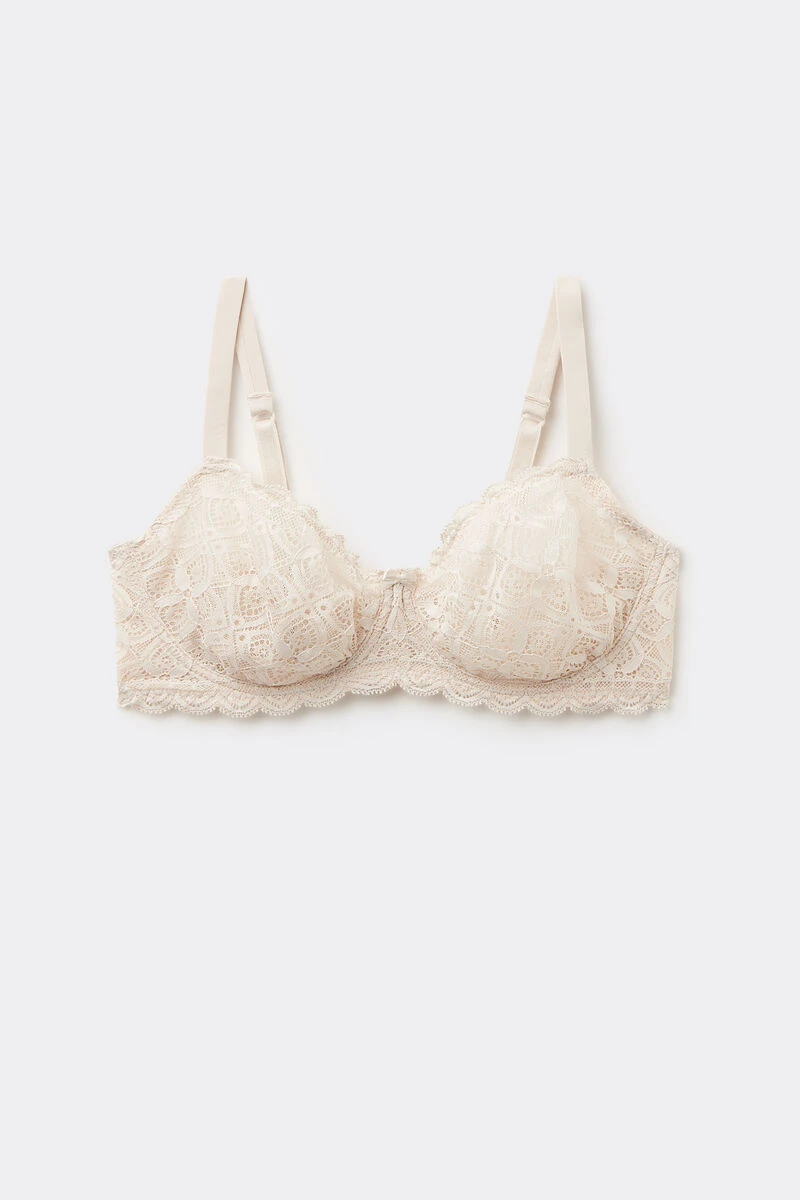 Daniela underwired balconette bra with non-padded pre-moulded cups. To add more support the cups and the underband have been reinforced with tulle. A wing has been added inside the cups to contain the bust and increase support (excpet size 34B). The straps are covered in microfibre and are adjustable at the back. To guarantee added comfort and a better fit, larger sizes are made with wider adjustable elasticated straps and more rows of hooks. Crafted from soft, comfortable stretch lace detailed with a geometric design and romantic frills. Ideal if you’re looking for comfort and support with a natural yet feminine and romantic feel.