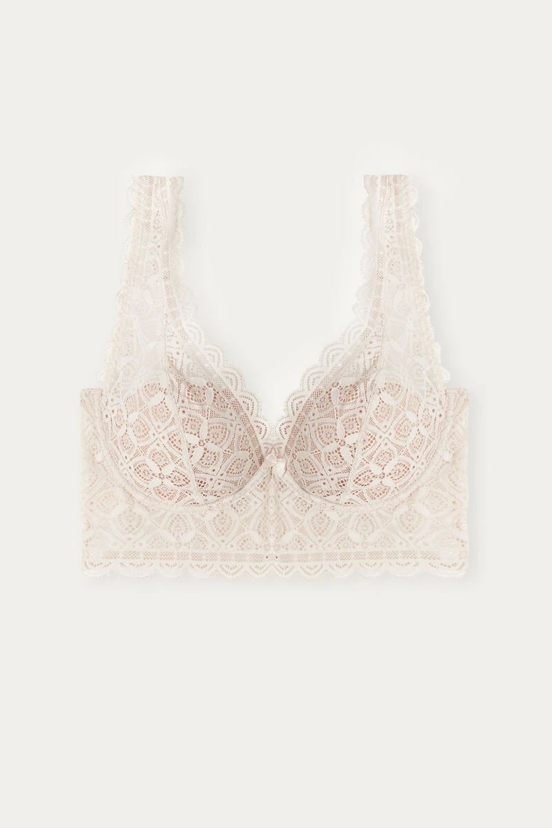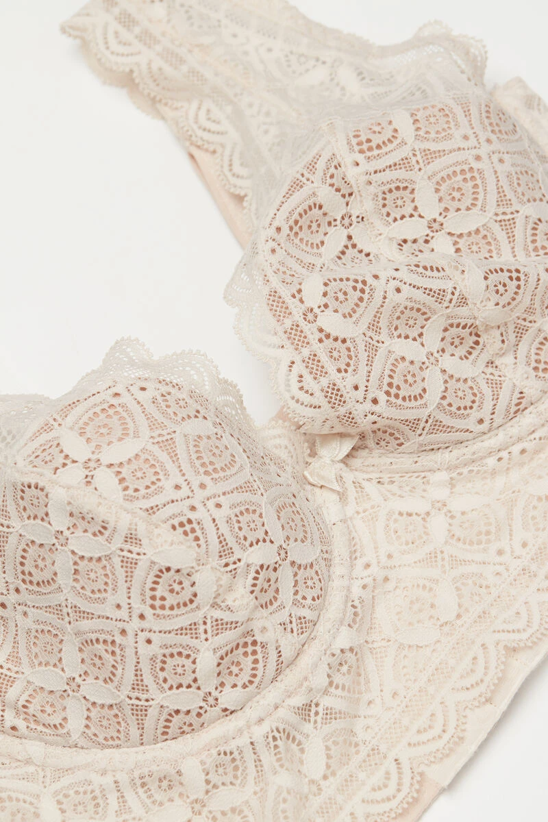 Eleonora balconette bra with underwire and semi-padded cotton-lined cups lined for light support. It is embellished with a lace ruffle on the underband to create a bralette effect, making it perfect for wearing under plunging necklines and sheer clothing. The straps are adjustable at the back. Crafted from soft, comfortable stretch lace detailed with a geometric design and romantic frills.