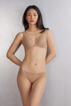 Fabiola push-up bra with no underwire and slightly graduated soft-touch lined cups. Soft boning at the sides lifts and supports the bust and the elasticated straps and fully adjustable. The underband is lined in tulle and fastens with four sets of three hooks. Crafted from soft, comfortable stretch lace detailed with a geometric design and romantic frills. The style features triangle-effect elongated lace cups and is ideal if you’re looking for an on-trend design that enhances the décolletage creating the effect of a larger size.