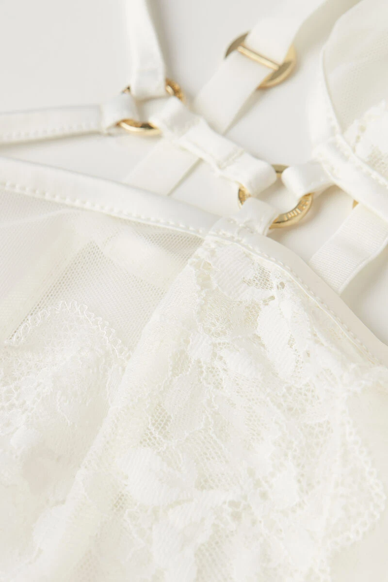 Babydoll with triangle cups, crafted from soft tulle and embellished with lace details. Complete with sensual elastic tapes and small gold rings with logo detail. The straps are adjustable at the back.