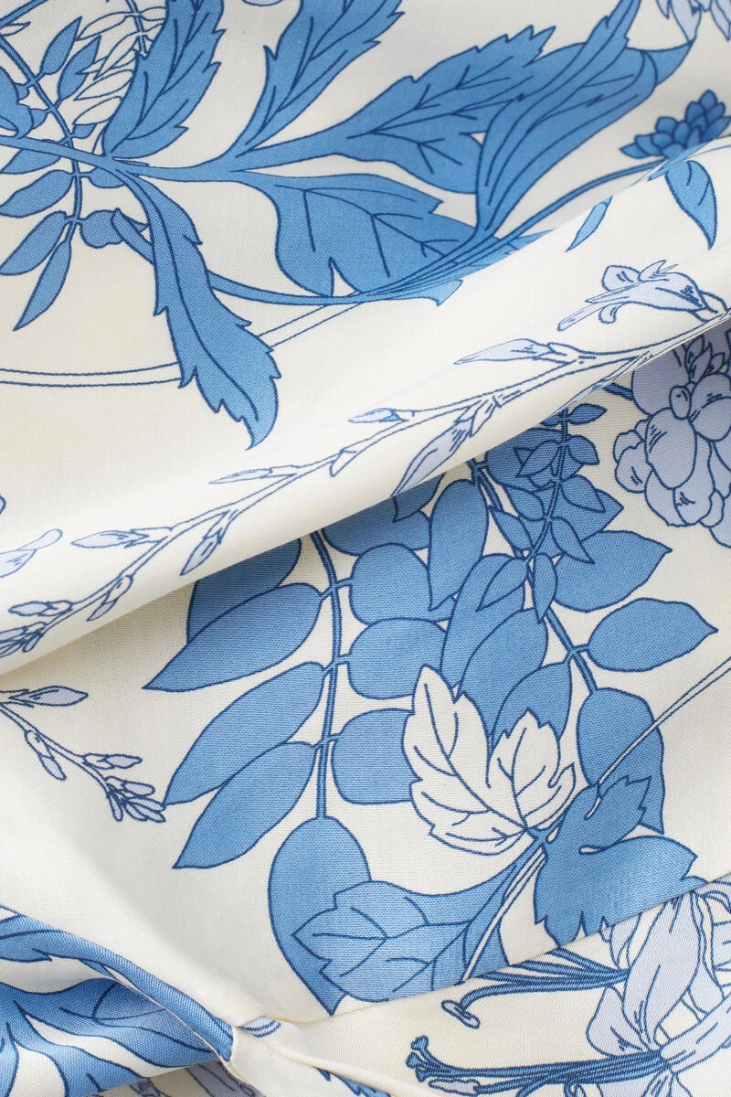 Viscose satin kimono dressing gown with romantic blue floral print. Three-quarter length sleeves and belted waist. Knee length.