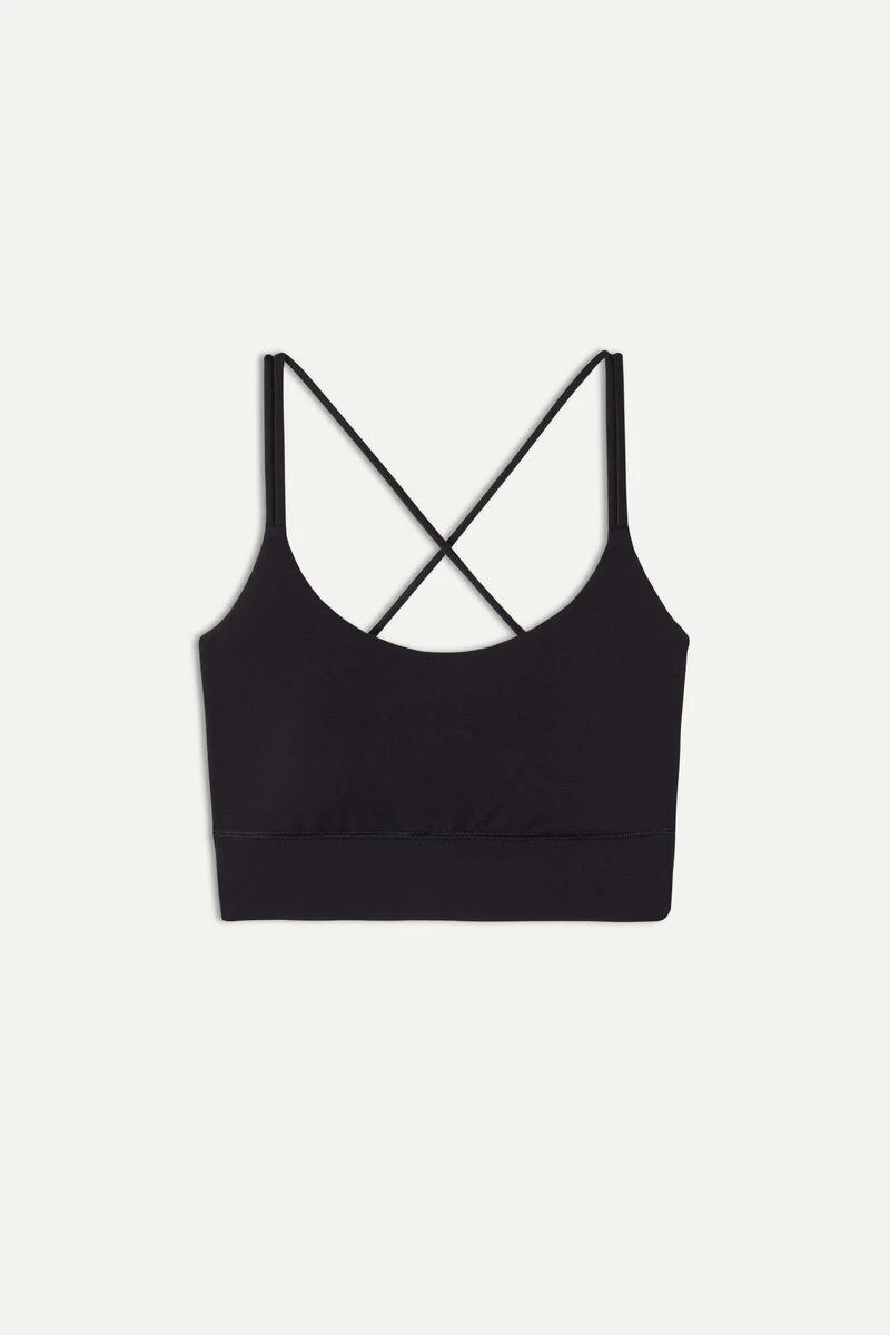 Bra top from the In Action line, lightly padded and non-wired with no fastening, featuring an underband and crossover straps on the back. Envelops and contains the bust to provide a compact and supportive fit.