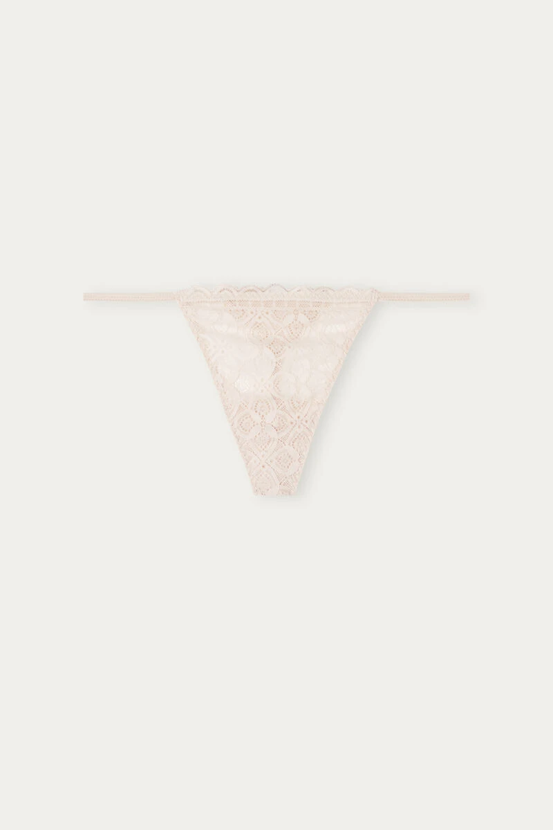 Stretch lace thong detailed with a geometric design and romantic frills. The thin side straps are made from stretch microfibre. 100% cotton gusset. Particularly suited to those looking for a sensual invisible effect.
