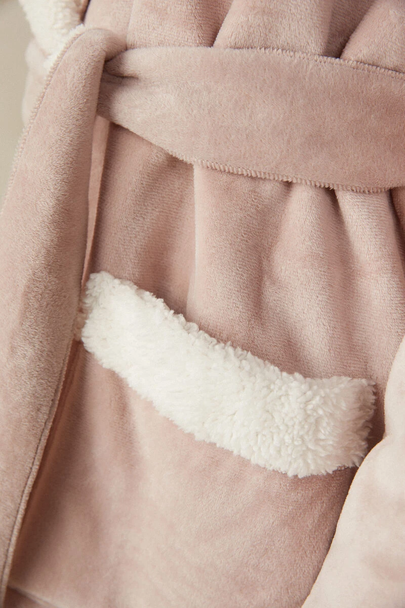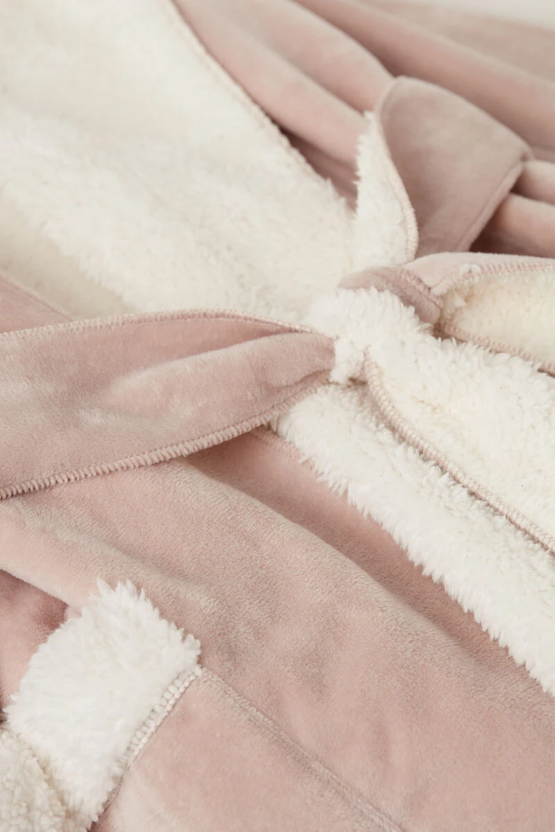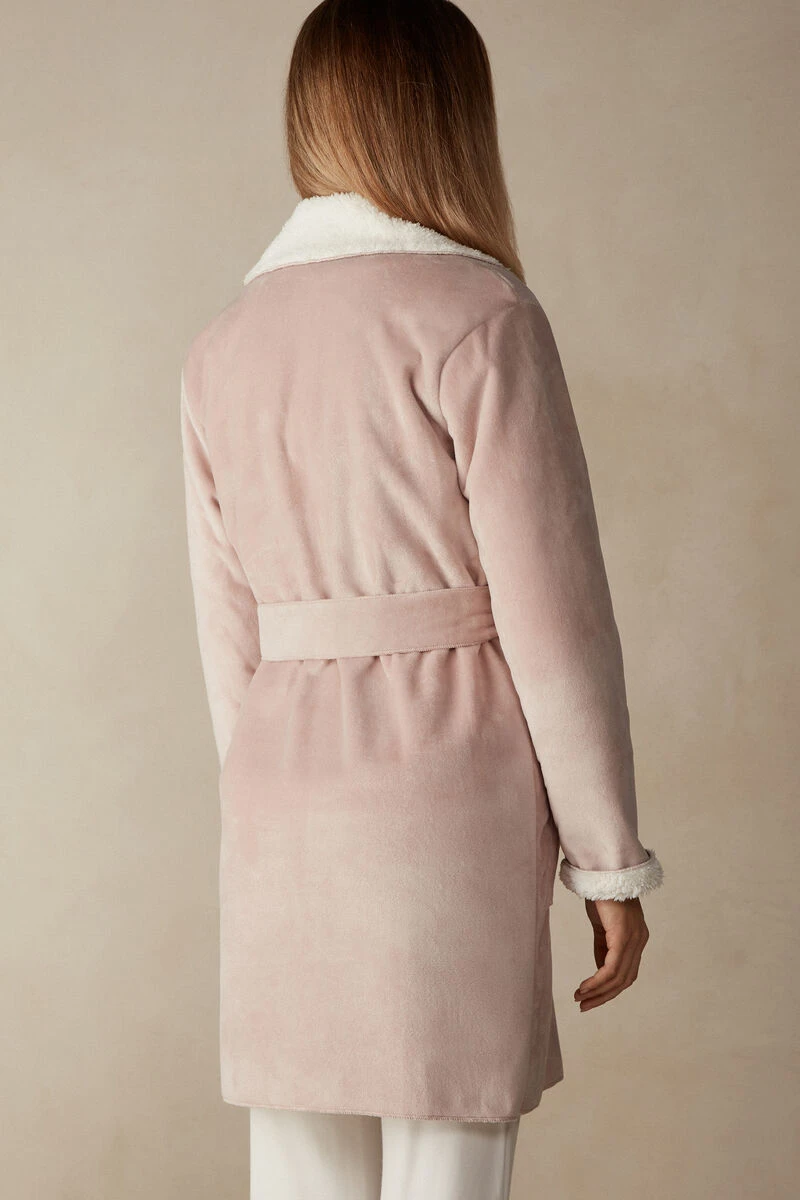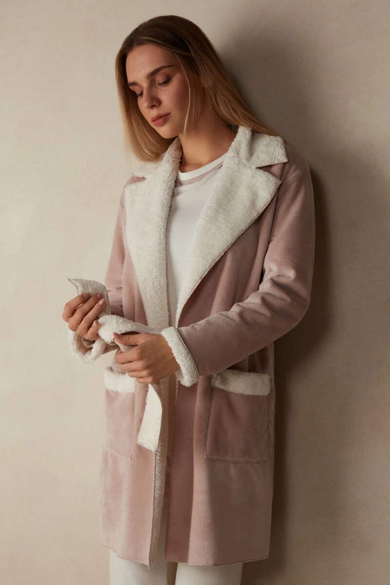 Fleece velour negligee with lapel collar and teddy inner. Belted waist and front pockets. Regular fit.
