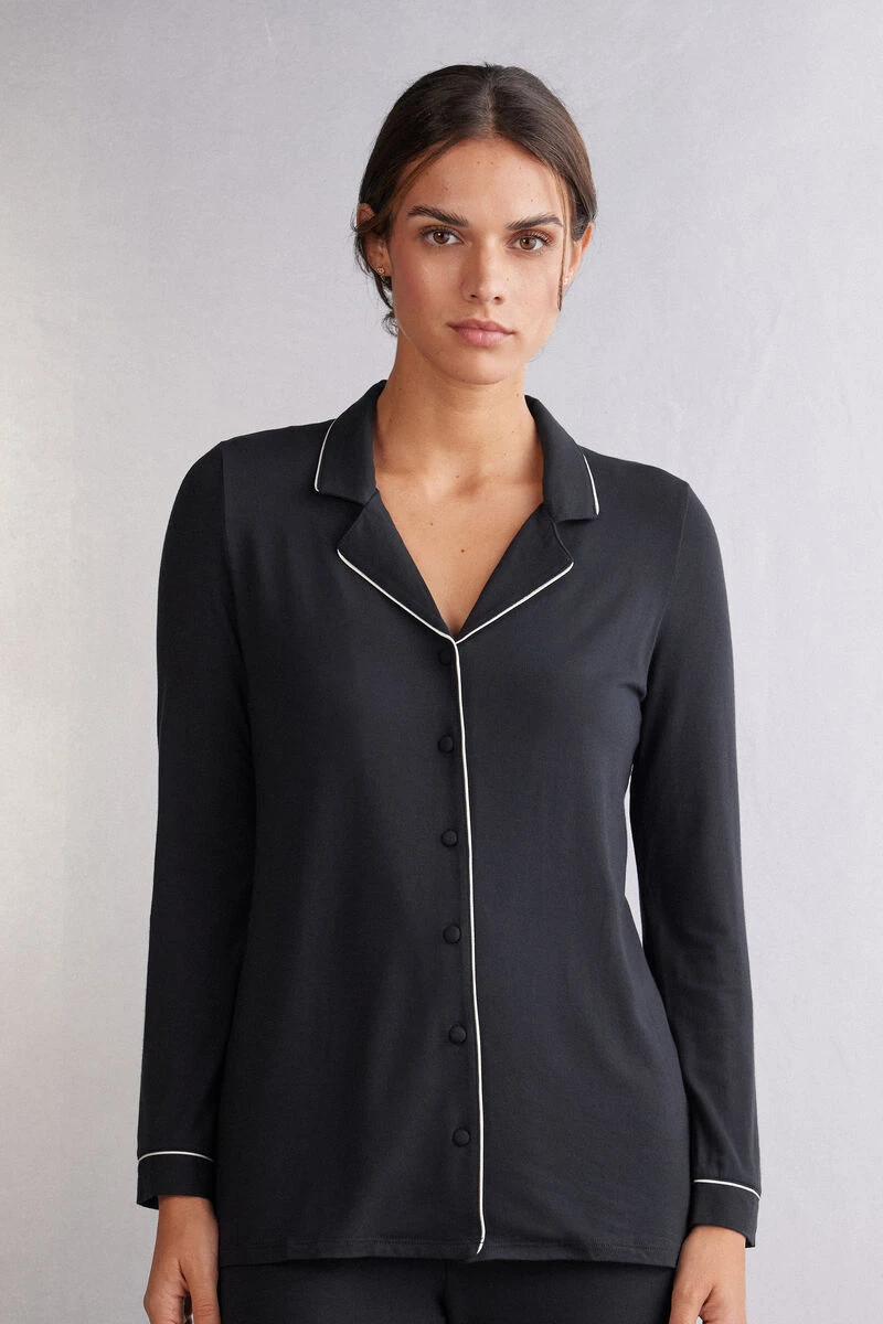 Long-sleeve micromodal jacket. Featuring contrast satin trim details.