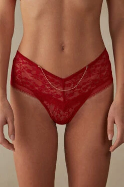 80s-style Brazilian-cut French knickers crafted from sensual and feminine stretch lace made with a motif of mini flowers. The style is embellished with a removable gold chain that can be adjusted using the eyelets at the waist. 100% cotton gusset.