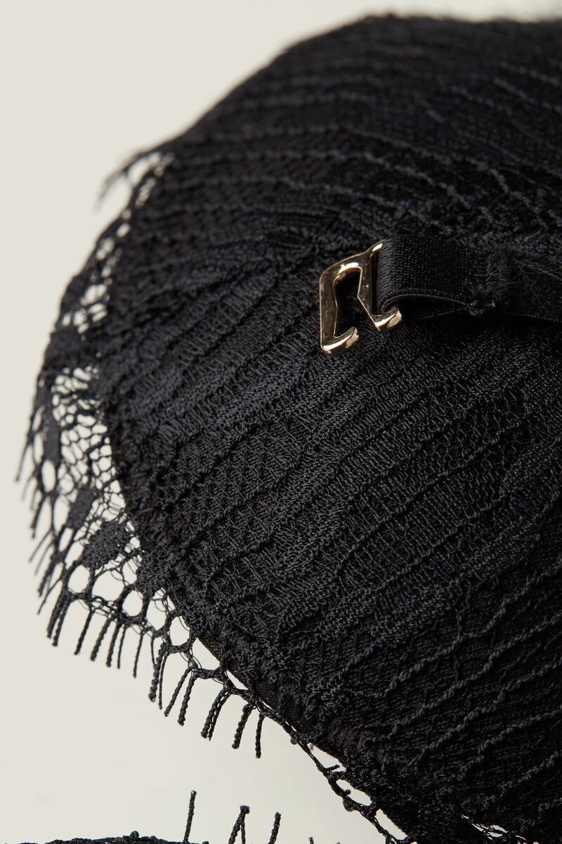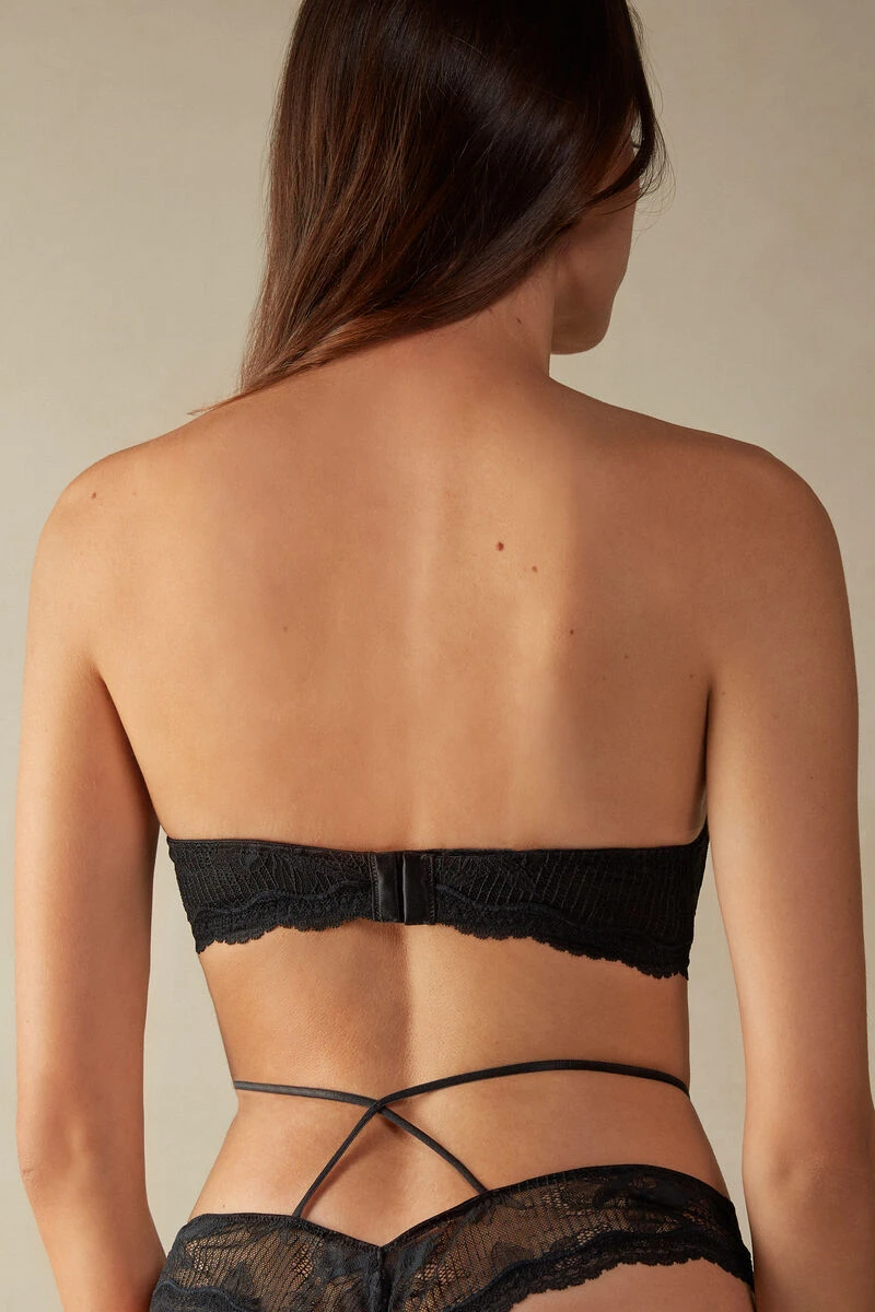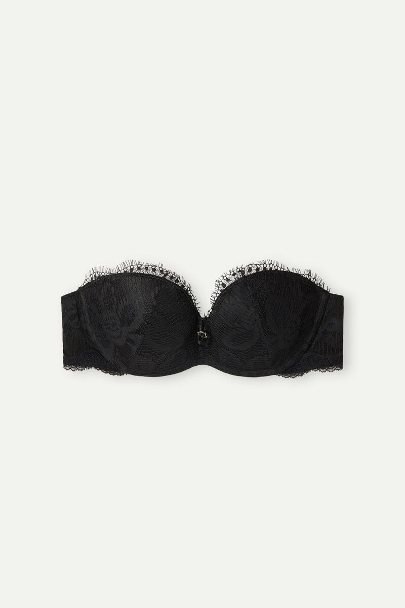 Monica push-up bandeau bra with underwire and moulded cups with graduated padding. Crafted in floral patterned stretch lace with a romantic and very feminine style. Featuring an elasticated neckline design embellished with gold detail. The underband is finished with silicone tape to remain in place on the body. Fully adjustable and detachable straps. This style is particularly suited to plunging necklines to create the appearance of a fuller bust.