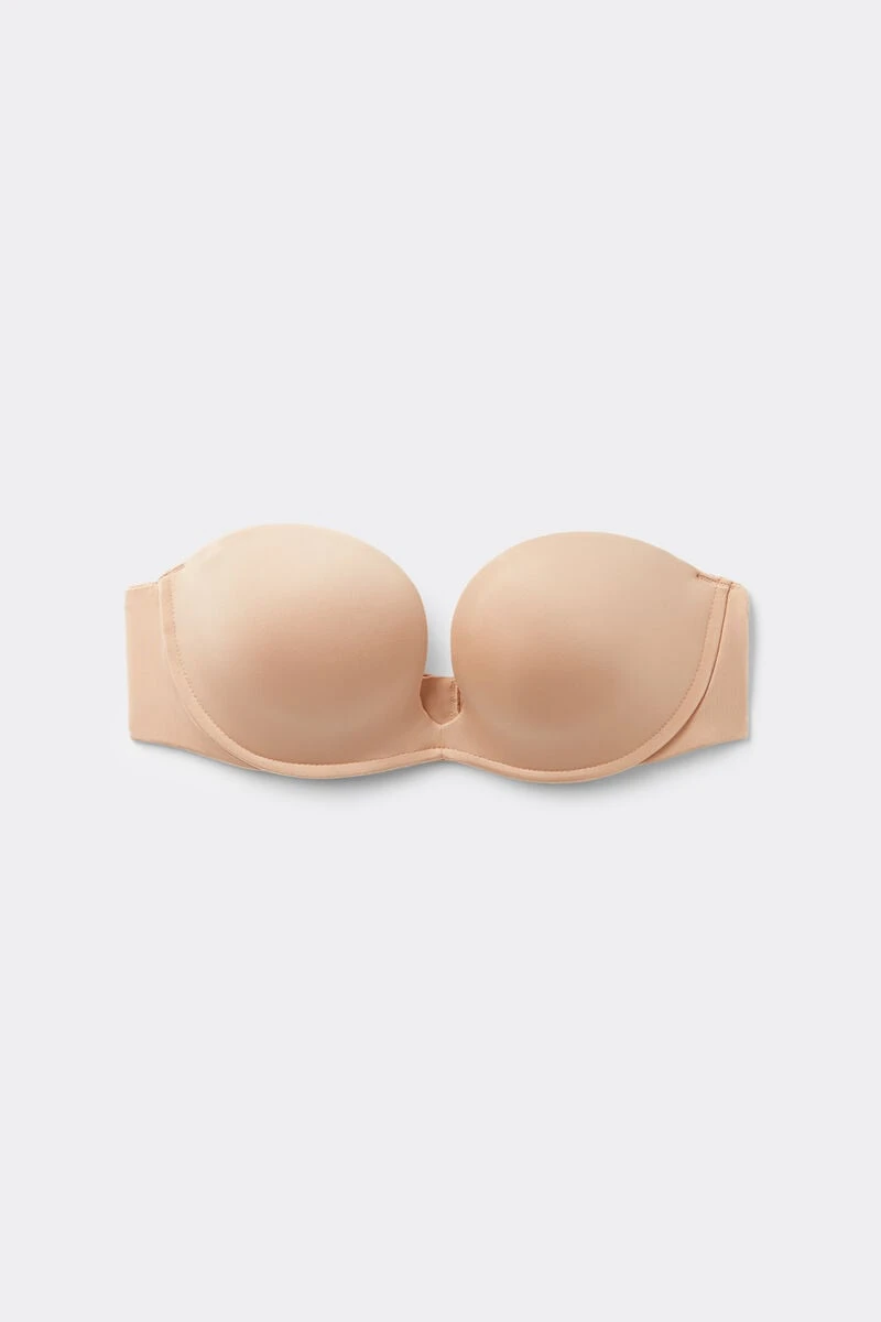 Monica ultralight microfibre push-up bandeau bra with underwire and moulded cups with graduated padding. Cotton cup lining. Silicone-backed underband lined in tulle, featuring multiple hidden hook holders for different strap styling options. Fully adjustable and detachable straps. This style is particularly suited to plunging necklines to create the impression of a fuller bust.