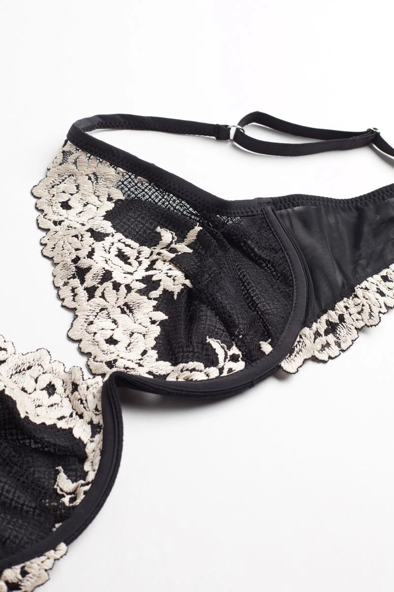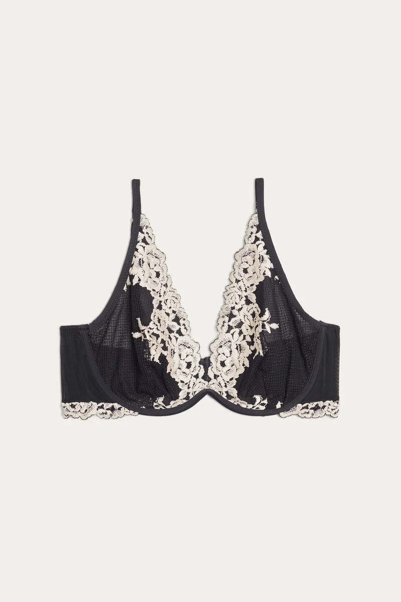 Non-padded underwired balconette bra made from two-tone lace. It features a plunging neckline and triangle-effect elongated cups. Tulle underband embellished with a lace frill. The microfibre-covered straps are adjustable at the back.