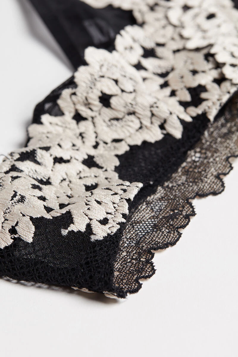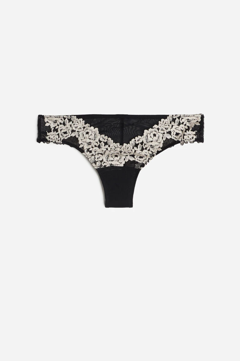 Tulle Brazilian briefs adorned with lace details. Depending on the colourway selected, the lace is contrasting or tone-on-tone. 100% cotton gusset.