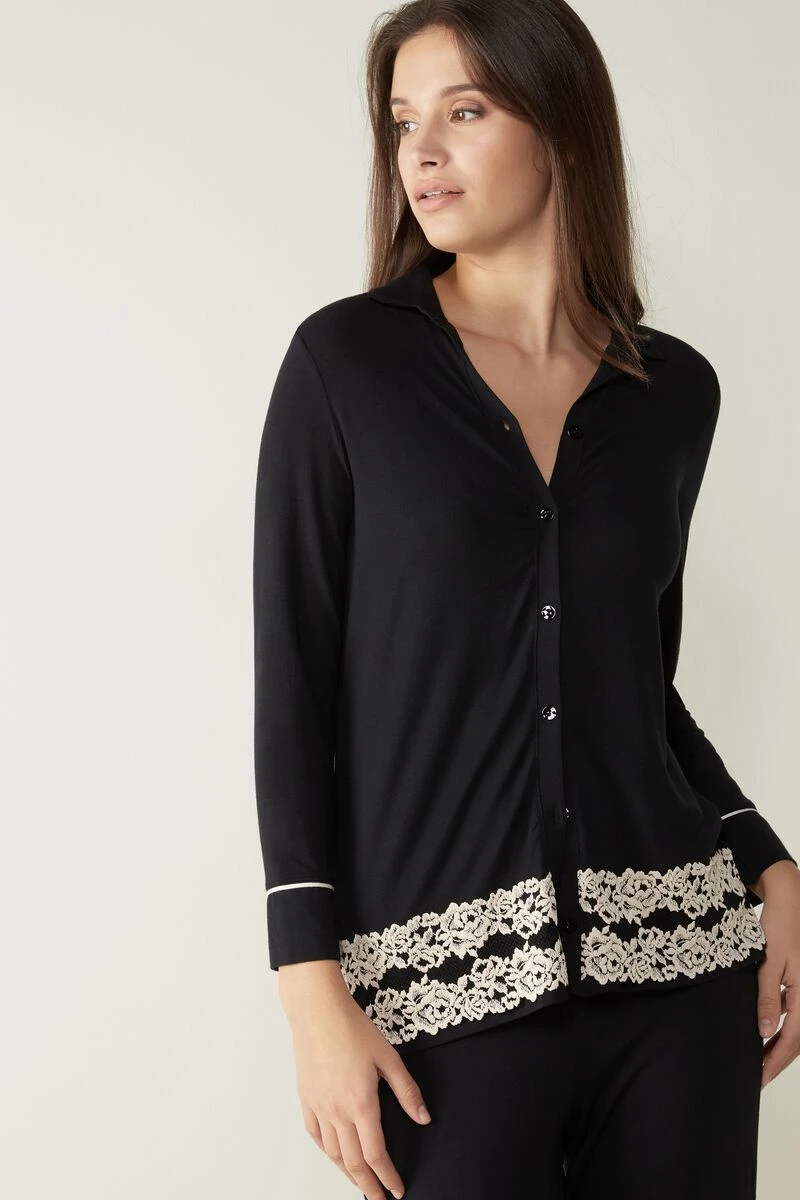 Long-sleeved modal top with front buttoning, embellished with two-tone lace frill on the hem. Contrasting trim on the cuffs. Regular fit.