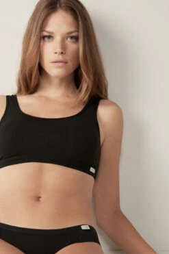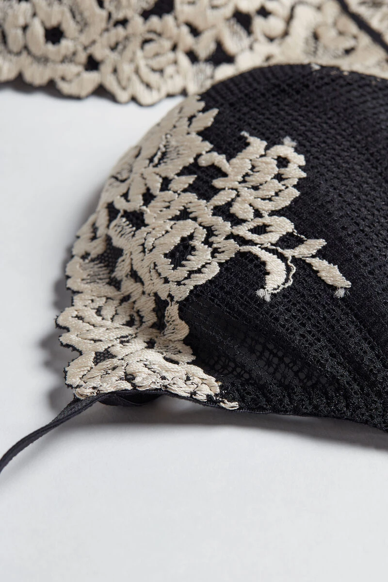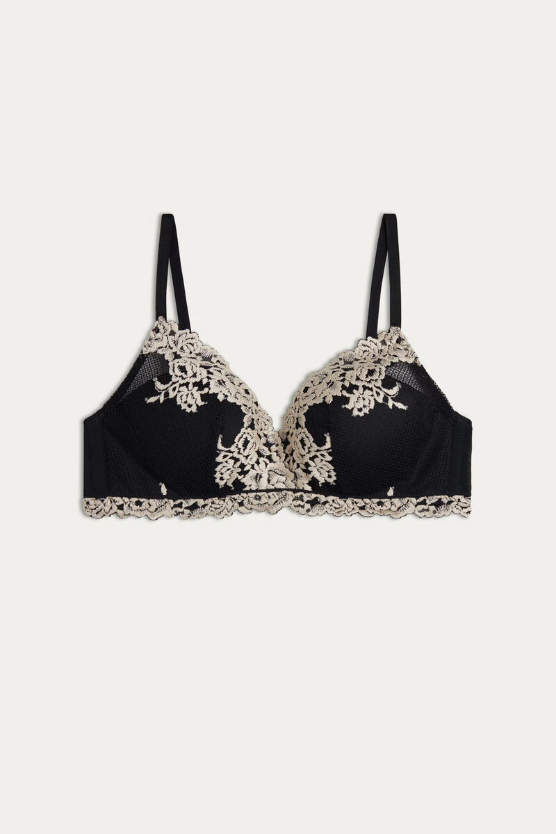Fabiola push-up bra with slightly graduated soft-touch padding made from two-tone stretch lace. It features triangle-effect elongated lace cups and has no underwire. Soft boning at the sides lifts and supports the bust. The elasticated straps are adjustable at the back.