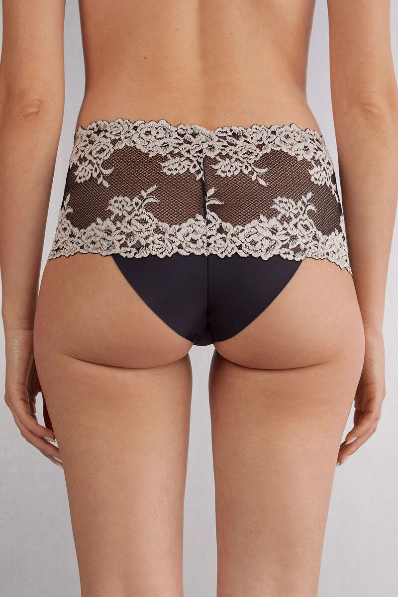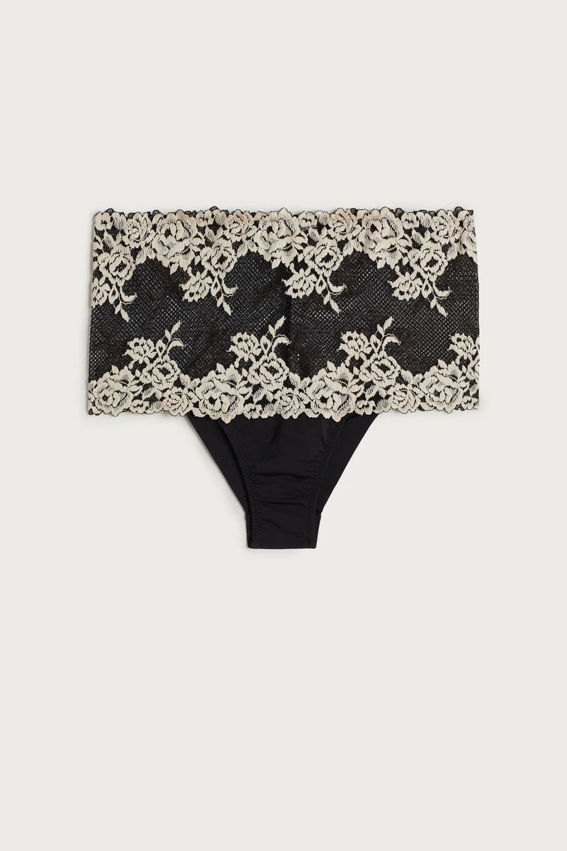 High-waisted French knickers crafted from soft microfibre embellished with a lace frill. Depending on the colourway selected, the lace is contrasting or tone-on-tone. High side. 100% cotton gusset.