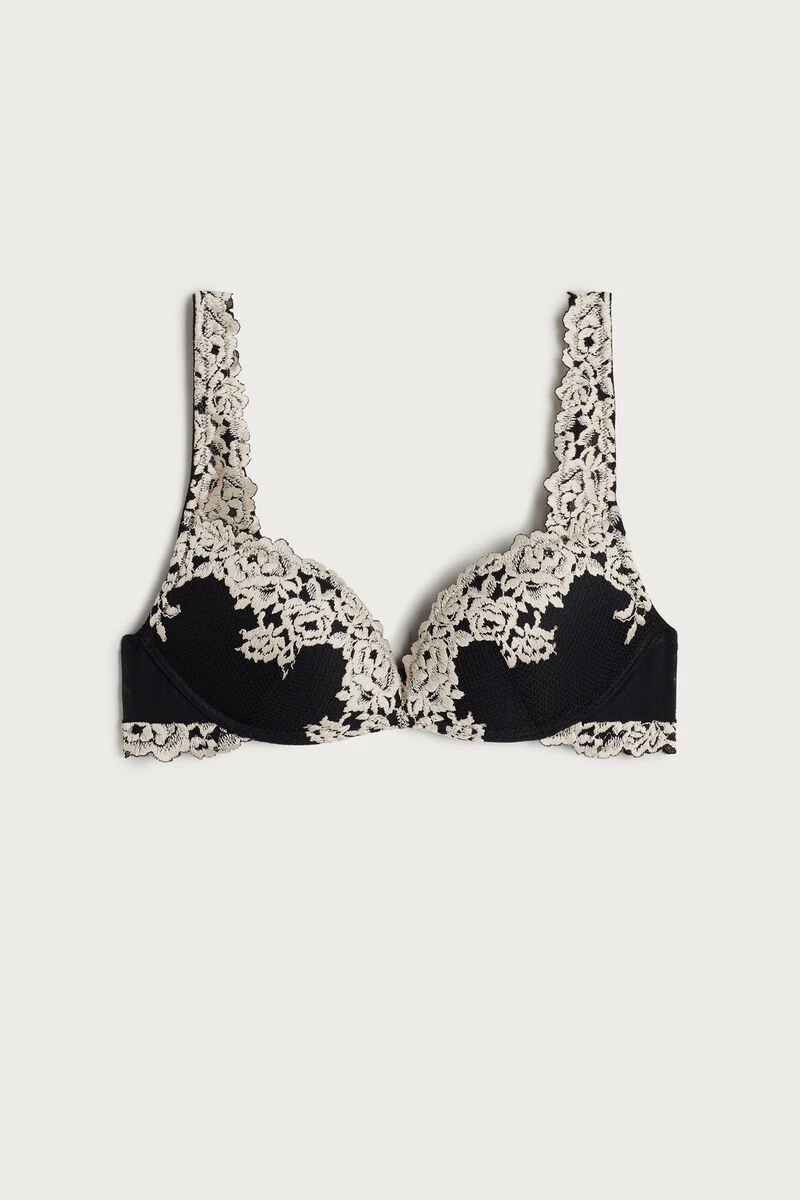 Wireless Gioia super push-up bra with heavily padded graduated moulded cups. Crafted from refined and elegant stretch lace with a tone-on-tone or contrasting floral pattern depending on the style. Lace-covered straps adjustable at the back. The ideal style to create a voluminous finish with the effect of a bust two sizes larger and a breathtaking décolletage.