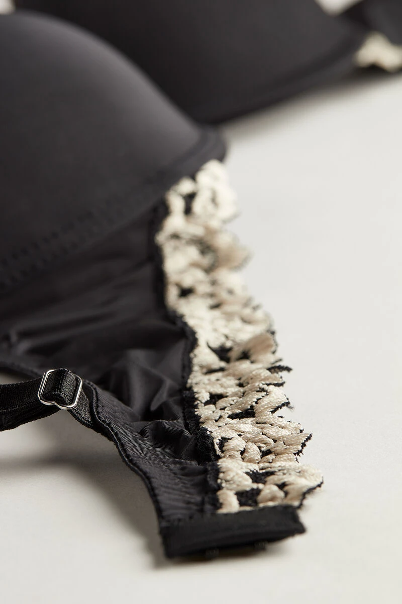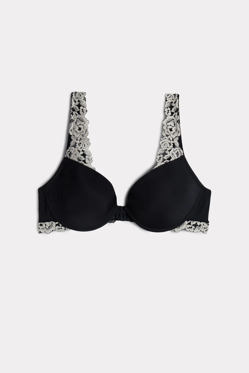 Bellissima push-up bra with lightly padded moulded cup and underwire, crafted from soft microfibre with lace trim. The straps feature a design in lace and are adjustable at the back. Depending on the colourway selected, the lace is contrasting or tone-on-tone.