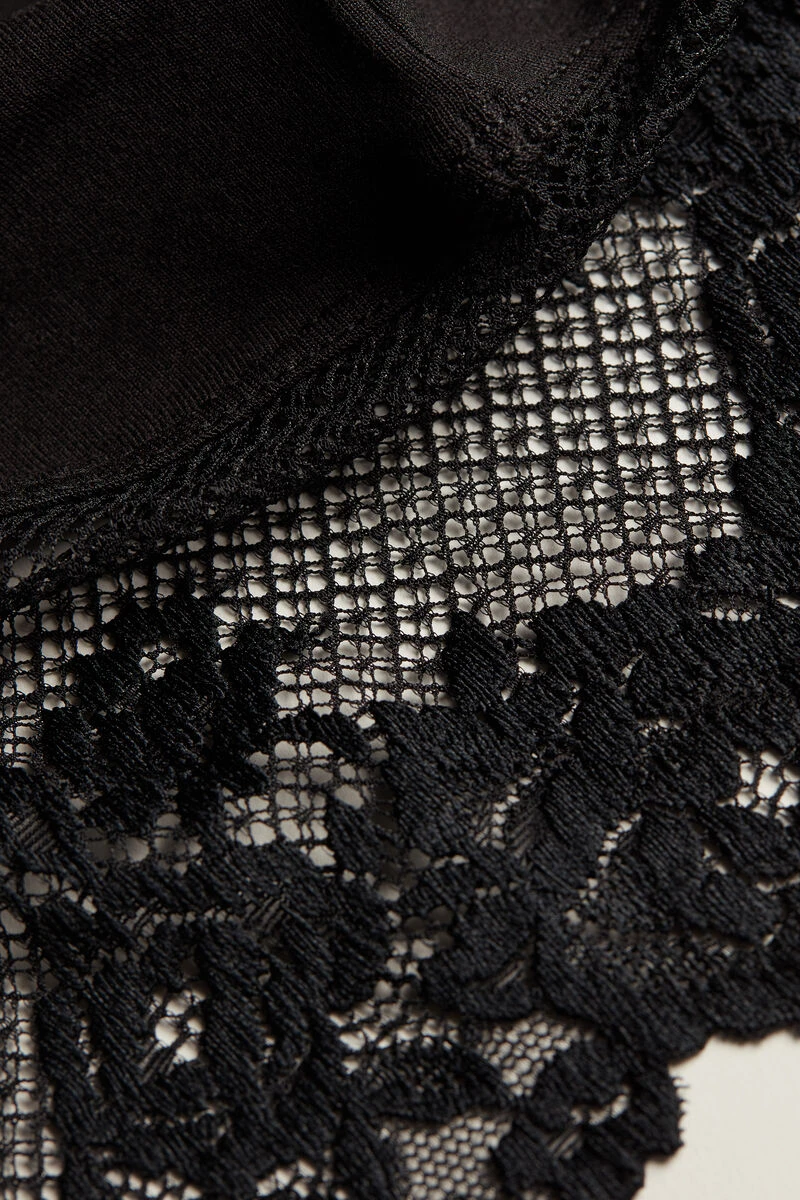 Modal slip with spaghetti straps, embellished with a lace frill on the neck and hem. Depending on the colourway selected, the lace is contrasting or tone-on-tone. It is ideal for wearing under sheer dresses or as nightwear. Close-fitting.