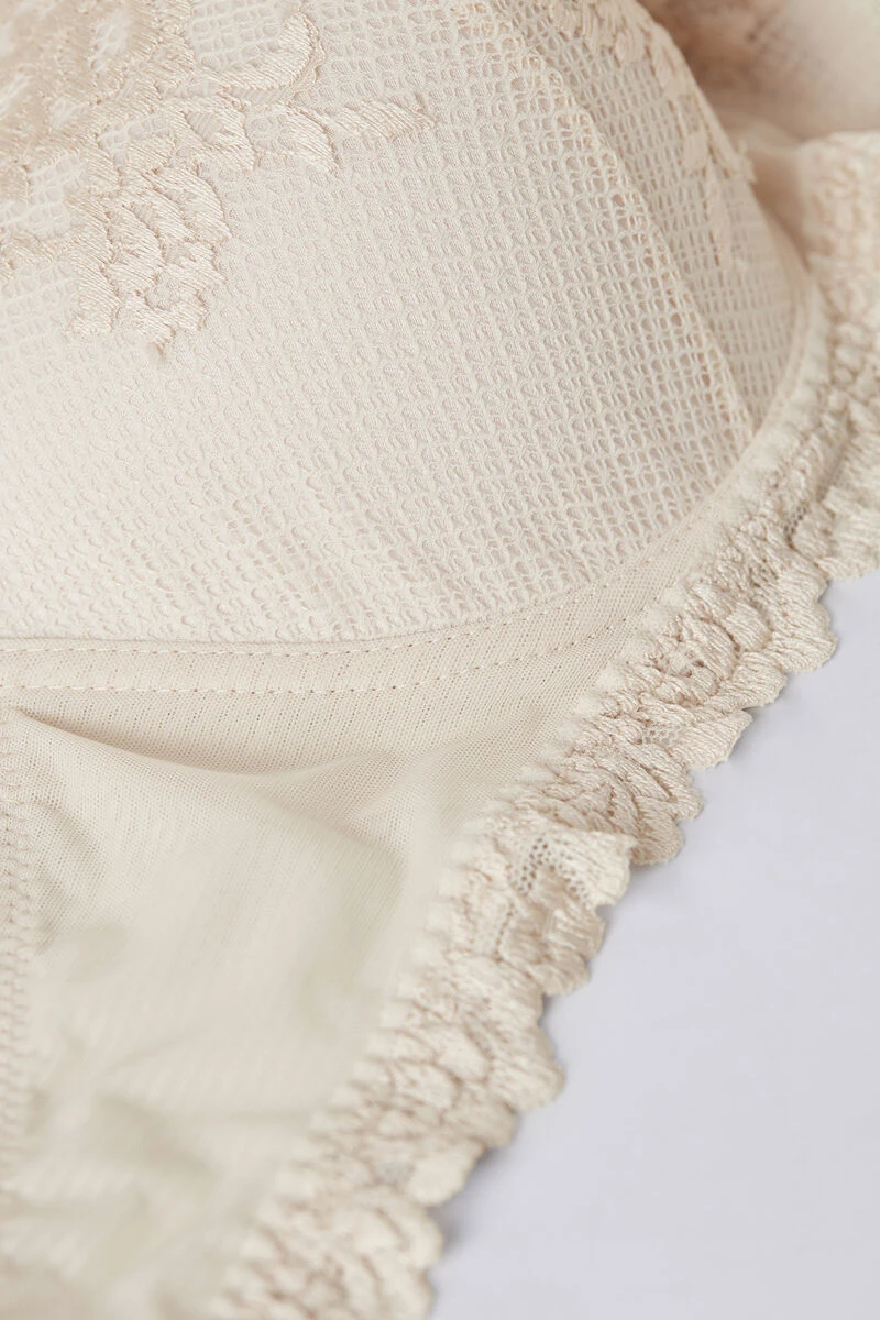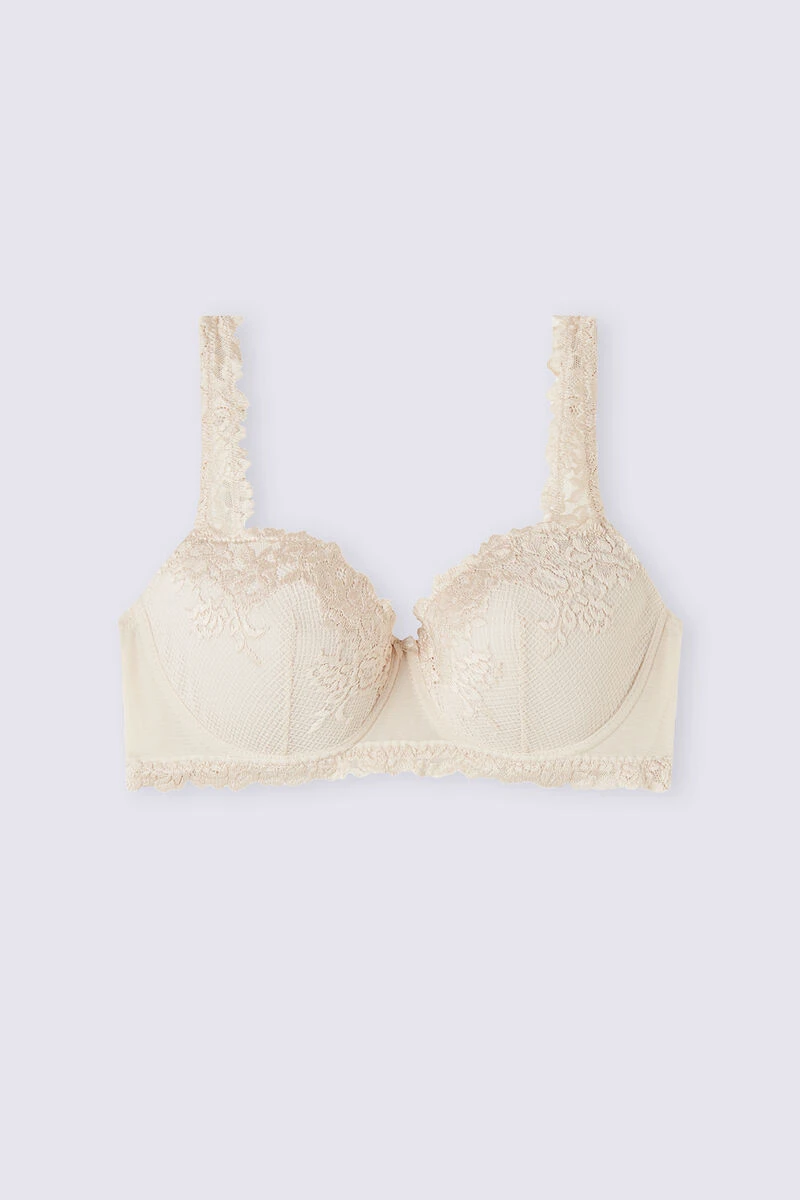Sofia balconette bra with lightly padded cups and shaping underwire that cups and supports the bust. Crafted from a refined and elegant lace and available in both two-tone and tone-on-tone variations. The underband has a double layer of tulle for a better fit. The shoulder straps are adjustable at the back. In larger sizes, the underband is higher and there is support in the cup to envelop and support the bust better. This style offers great support and enhances the décolletage for a feminine and sensual look.