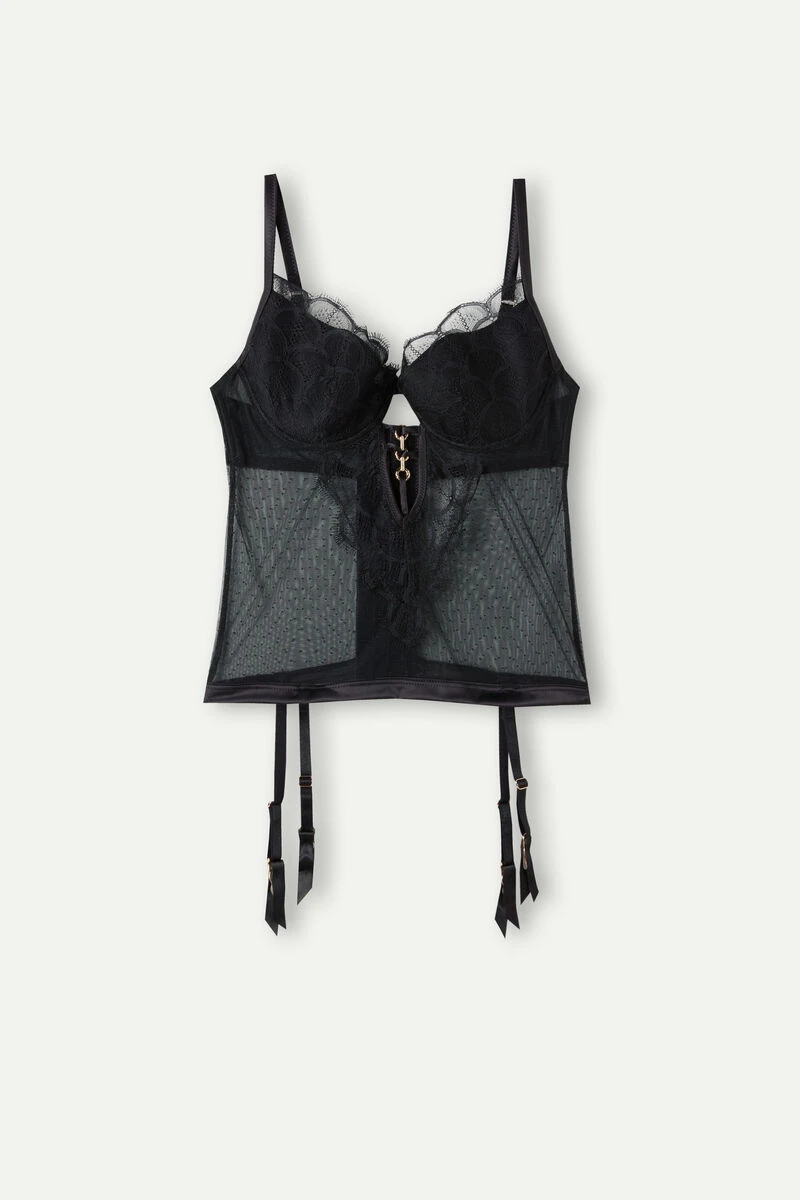Basque with Carioca bra, underwired with padded cups. It’s crafted from plumetis tulle and lace with a refined geometric design. The sensual neckline is embellished with a lace frill and satin trim, with a rhinestone jewel in the centre. The satin straps are adjustable at the back.