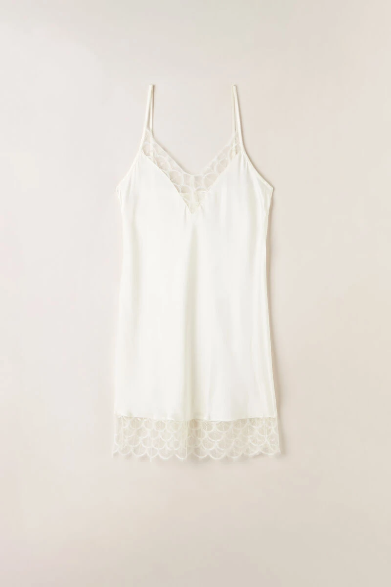 Silk satin V-neck slip embellished with an elegant geometric pattern lace flounce. Adjustable spaghetti straps. Regular fit.