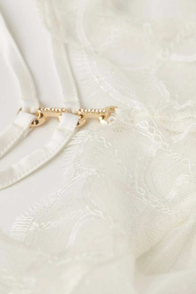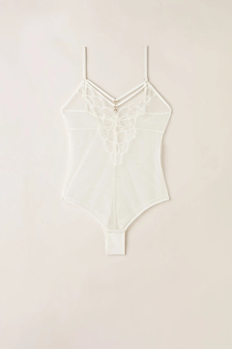Bodysuit with triangle cups, crafted from soft plumetis tulle. Sensual neckline embellished by the lace flounce and the satin motifs with a jewel accessory detail complete with rhinestones. Satin straps adjustable at the back. 100% cotton gusset with press-stud closure.