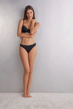 Panties with front crafted from floral-embroidered tulle with a tattoo effect embellished with jewels. Seamless soft double-layer tulle back. 100% cotton gusset.