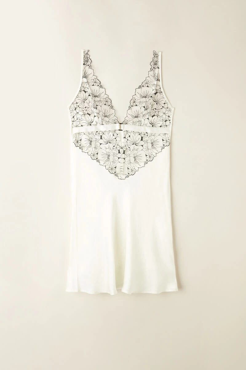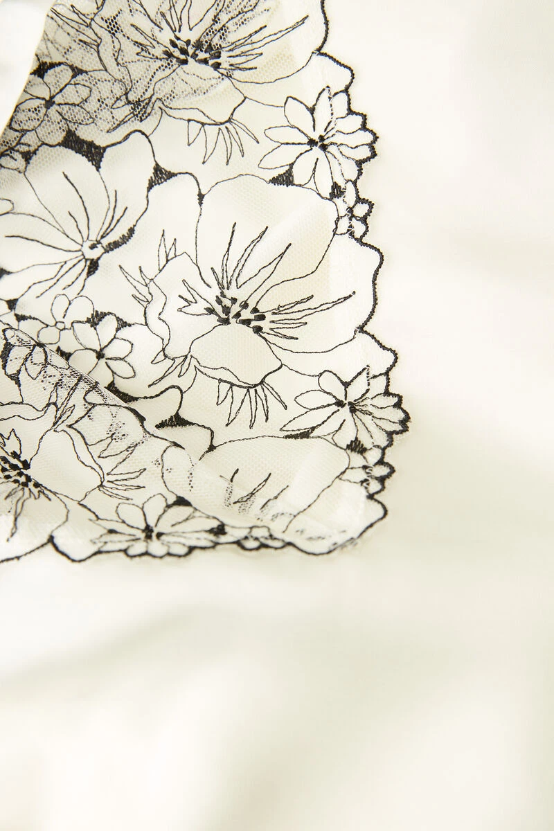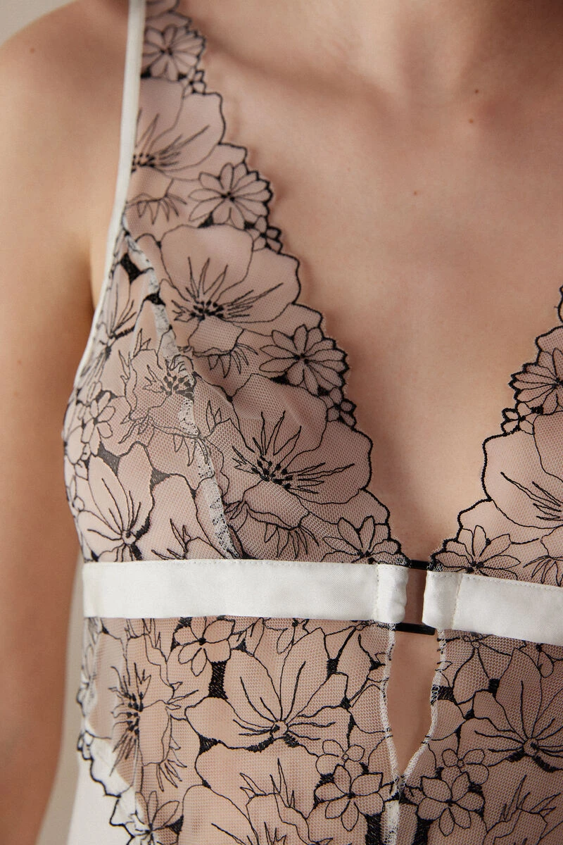 Viscose satin slip with cups and floral-embroidered tulle insert with a tattoo effect. Satin underband with jewel detail. The straps are adjustable at the back.