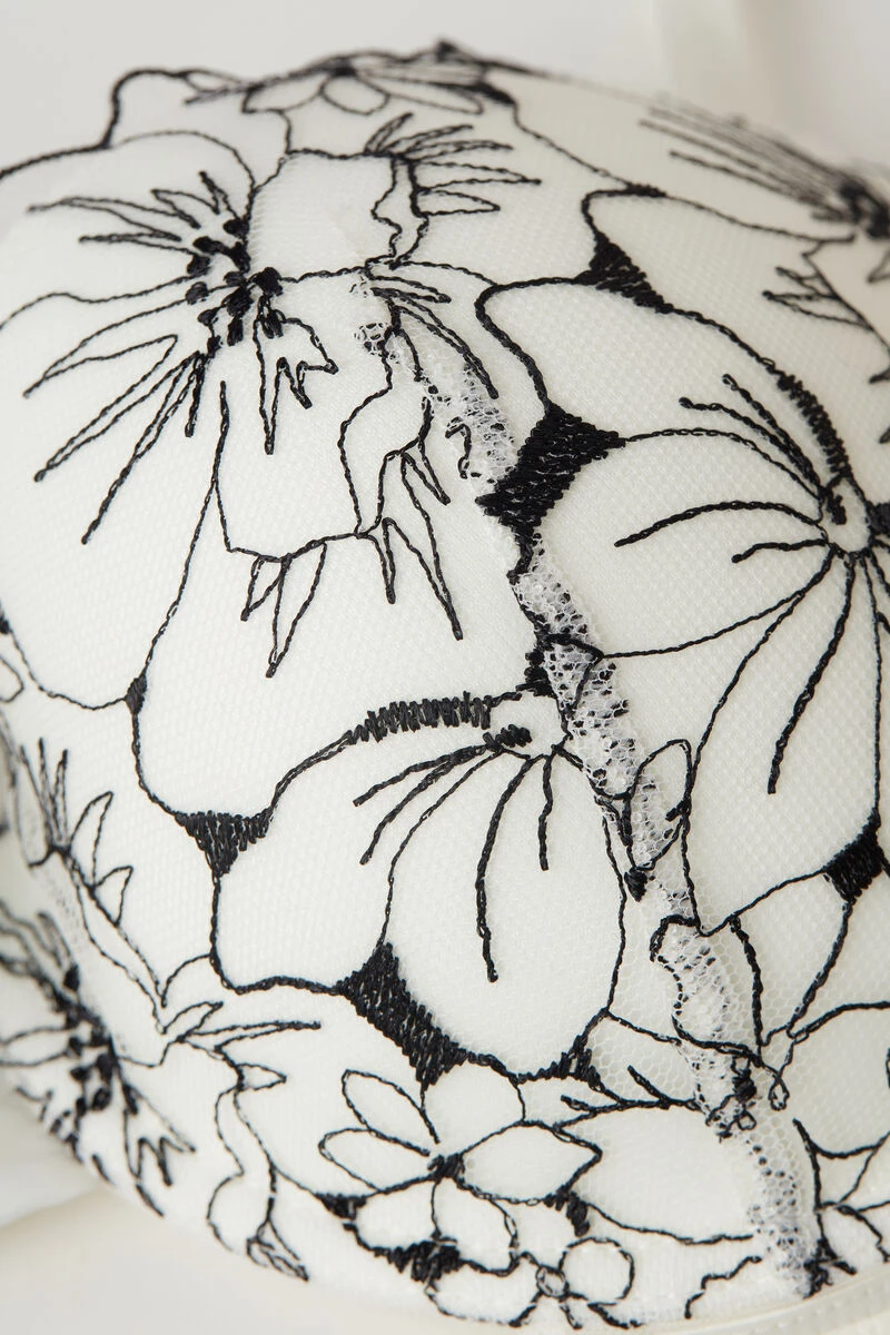 Sofia slightly padded balconette bra with underwire. Crafted from floral-embroidered tulle with a tattoo effect and trimmed with satin. Embellished with a jewel detail under the bust. The underband is made from soft tulle. The shoulder straps are covered in satin and are adjustable at the back. This style guarantees great support and enhances the cleavage with a soft shape, creating a feminine and sensual look.