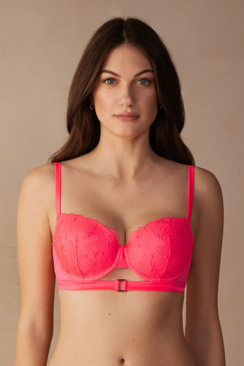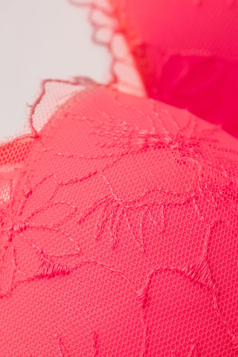 Sofia slightly padded balconette bra with underwire. Crafted from floral-embroidered tulle with a tattoo effect and trimmed with satin. Embellished with a jewel detail under the bust. The underband is made from soft tulle. The shoulder straps are covered in satin and are adjustable at the back. This style guarantees great support and enhances the cleavage with a soft shape, creating a feminine and sensual look.