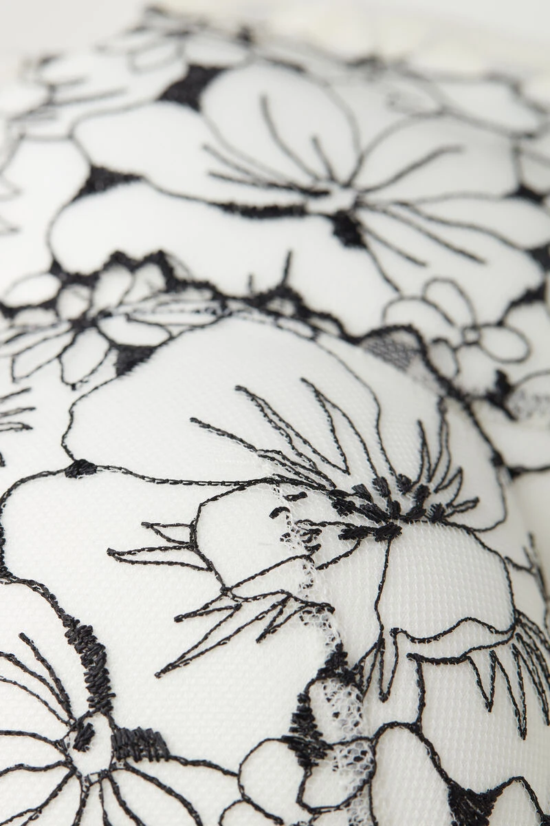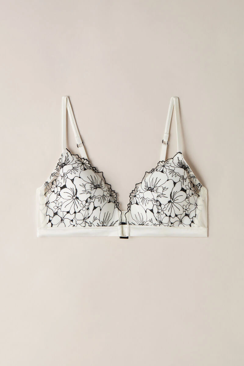 Tiziana non-wired triangle bra with slightly padded cups and boning at the sides. Crafted from floral-embroidered tulle with a tattoo effect and trimmed with satin. Embellished with a jewel detail in the middle. The underband is made from soft tulle. The shoulder straps are covered in satin and are adjustable at the back. This bra creates the subtle effect of a rounded bust with a glamorous and feminine style.