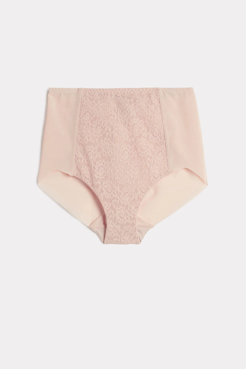 High-waisted French knickers in sculpting tulle with lace-effect jacquard tulle double layer at the front. Featuring a raw cut on the leg and a gathering at the back that envelops and enhances curves. Pure cotton inner gusset.