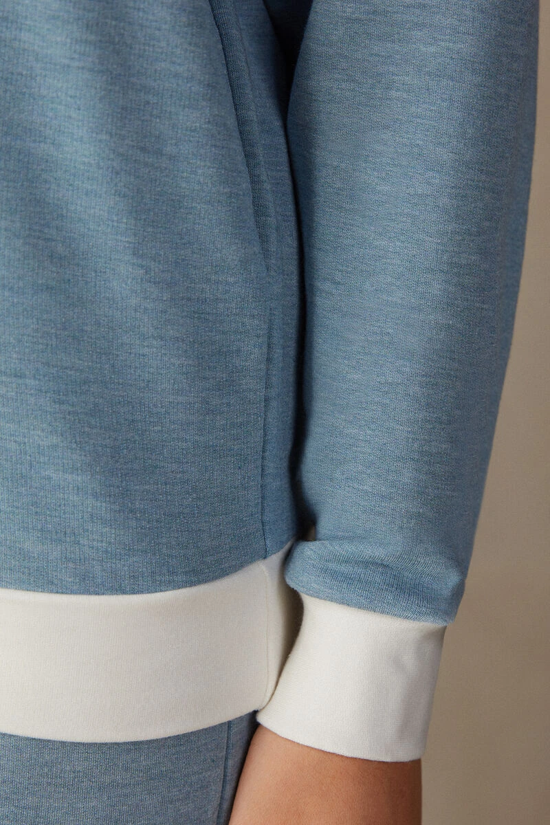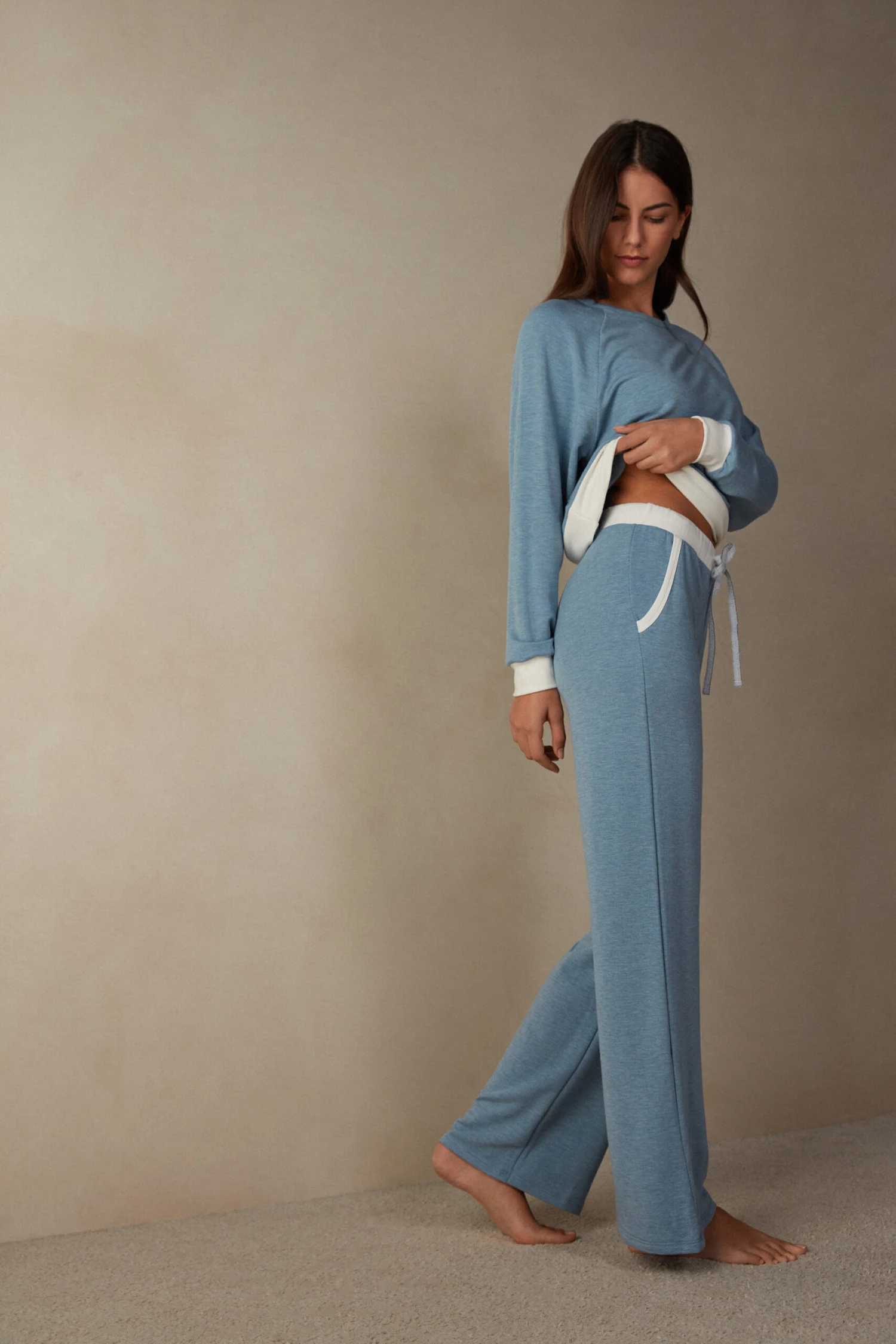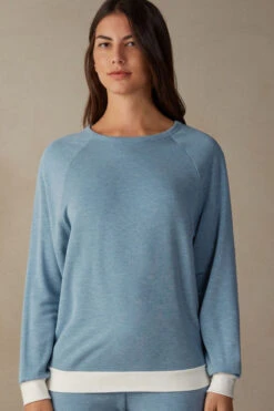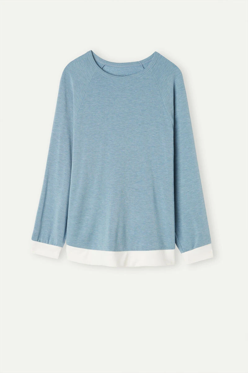 Round-neck top with long raglan sleeves, crafted from soft and warm modal fleece with wool. Contrasting cuffs on sleeves and band at hem. Relaxed fit.