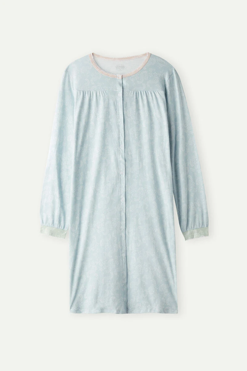 Button-up nightdress made from ultrafresh Supima® cotton jersey with cashmere pattern print. Contrasting neck and cuffs trimmed with romantic loop stitch. Yoke on front and back with light gathering. Regular fit.