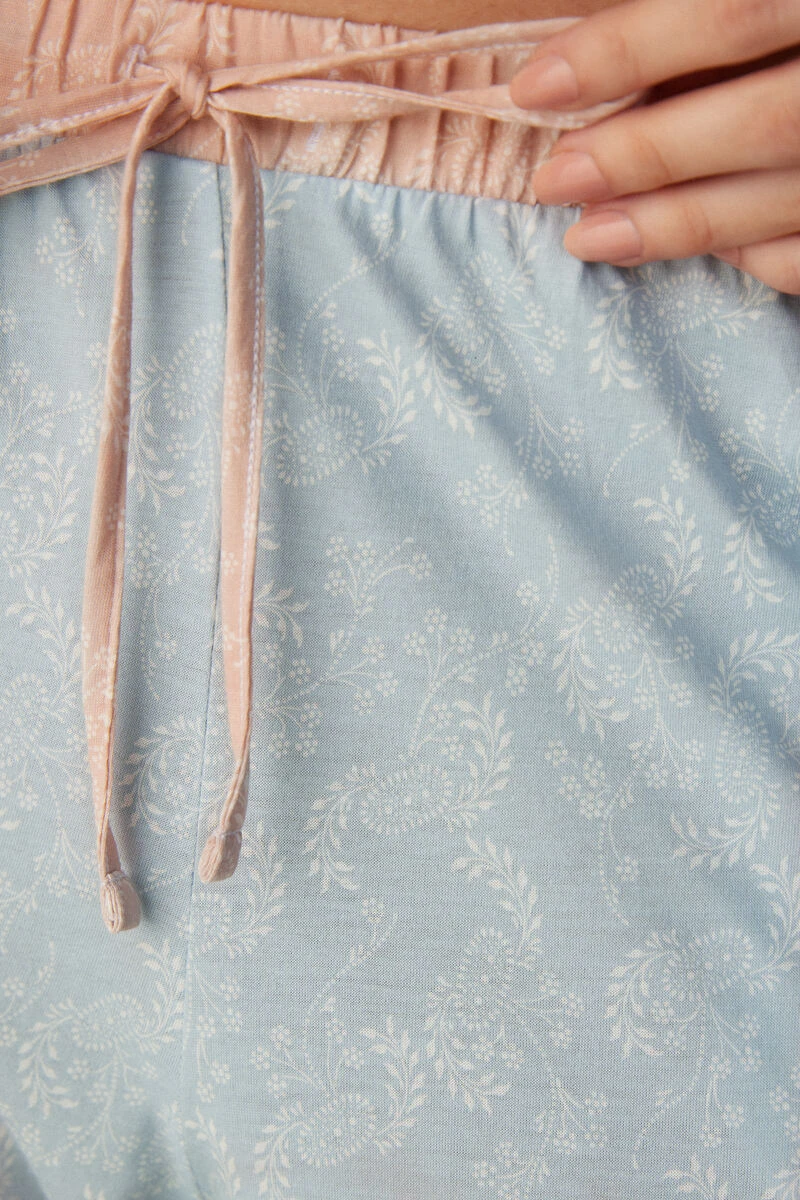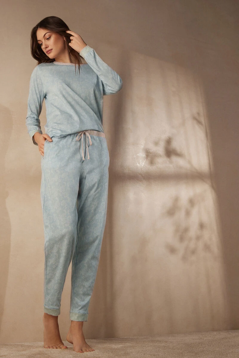 Full-length trousers made from ultrafresh Supima® cotton jersey with cashmere pattern print. Drawstring waist and contrasting trim. Front pockets. Leg hems embellished with a romantic loop stitch. Carrot cut and relaxed fit.