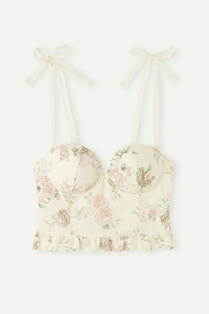Basque with lightly padded balconette cups, underwire and boning at the sides. Crafted from plain-weave cotton with a romantic rose print and frill at the hem. The removable lace straps can be tied in a romantic bow. The top fits comfortably to the bust via silicone tape meaning it can be worn strapless. Soft double-layer Swiss-dot tulle insert at the back.