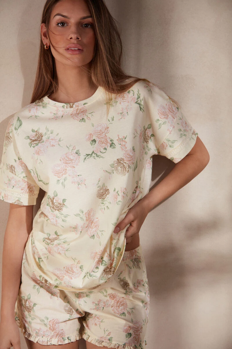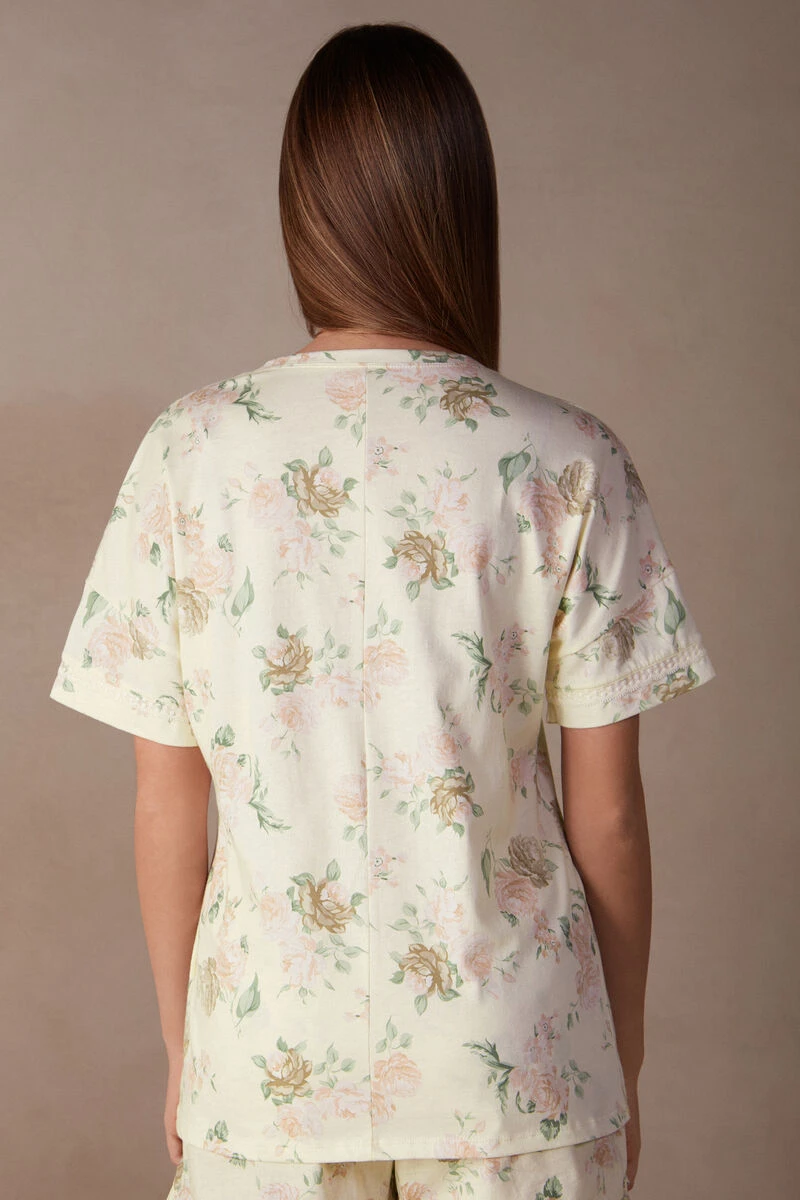Supima® cotton jersey top with crew-neck and short kimono sleeves. Featuring a romantic rose print and decorative trim on the sleeves. Relaxed fit.