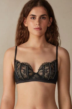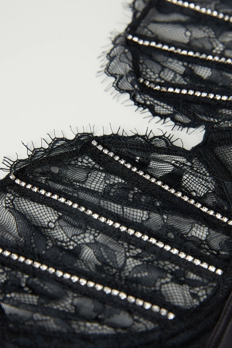 Balconette bra with underwire and boning at the sides, made from stretch floral lace with elegant satin trim. The cups are embellished with soft rhinestone-covered boning for a corset effect, adding a touch of light with a glamorous finish. The satin-covered straps can be adjusted at the rear. This style gathers the bust and enhances the décolletage.