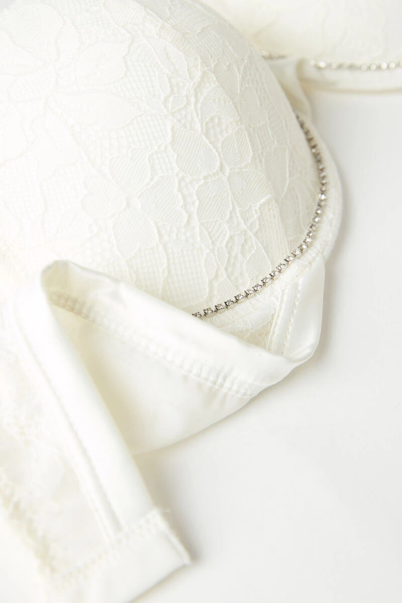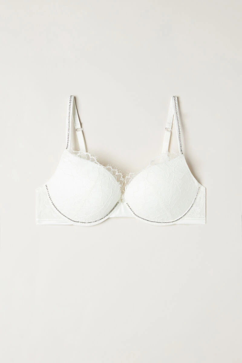 Elettra super push-up bra with underwire and heavily padded moulded graduated cups. Made from stretch floral lace and embellished with satin trim. A glamorous detail to be shown off, the rhinestones add a touch of light to the style. The shoulder straps are covered in satin and are adjustable at the back. Ideal to accentuate the décolletage and to create the effect of a larger size.