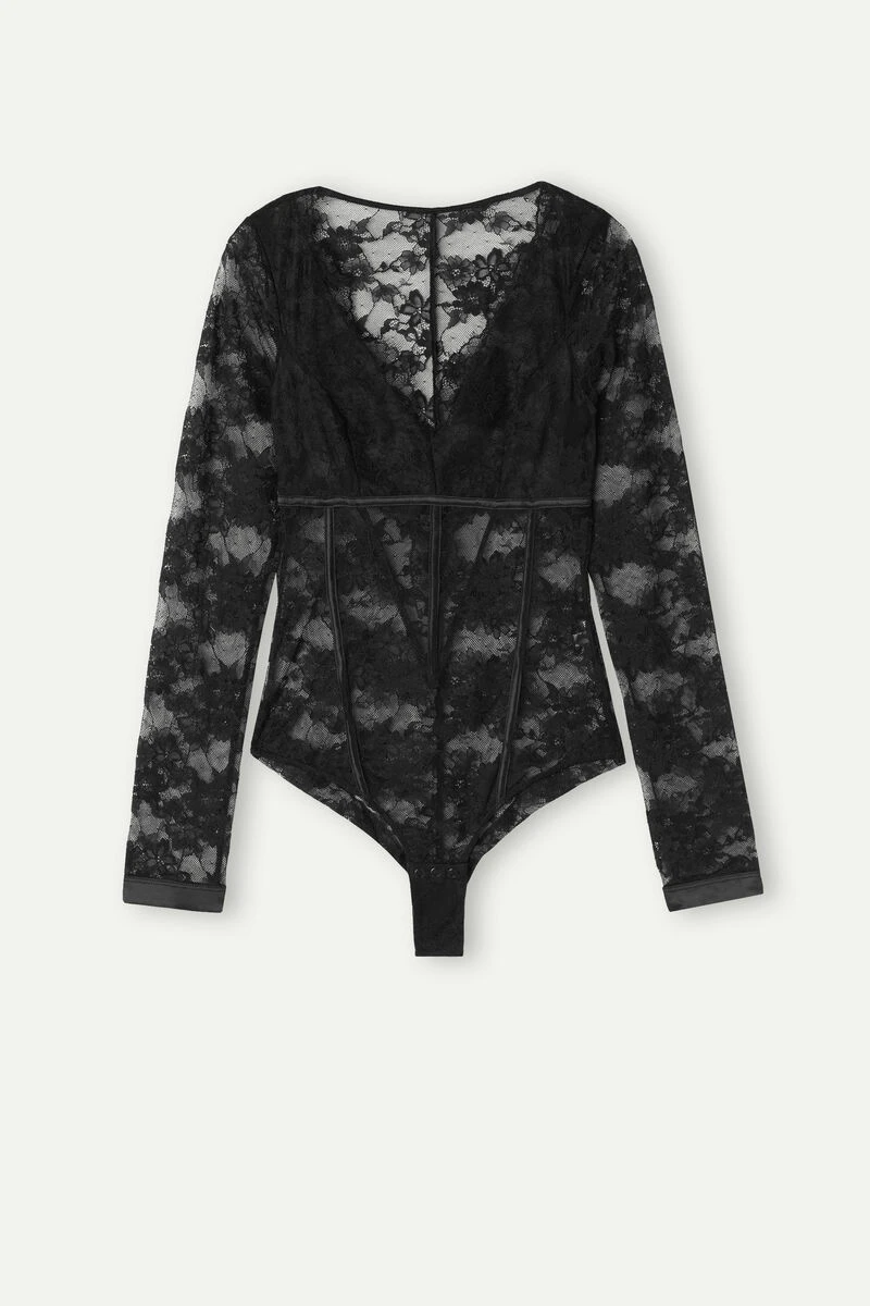 Long-sleeved V-neck body made from stretch floral lace and embellished with elegant satin trim. Gently envelops the body. Ideal to wear on its own or peeping out from under a jacket.