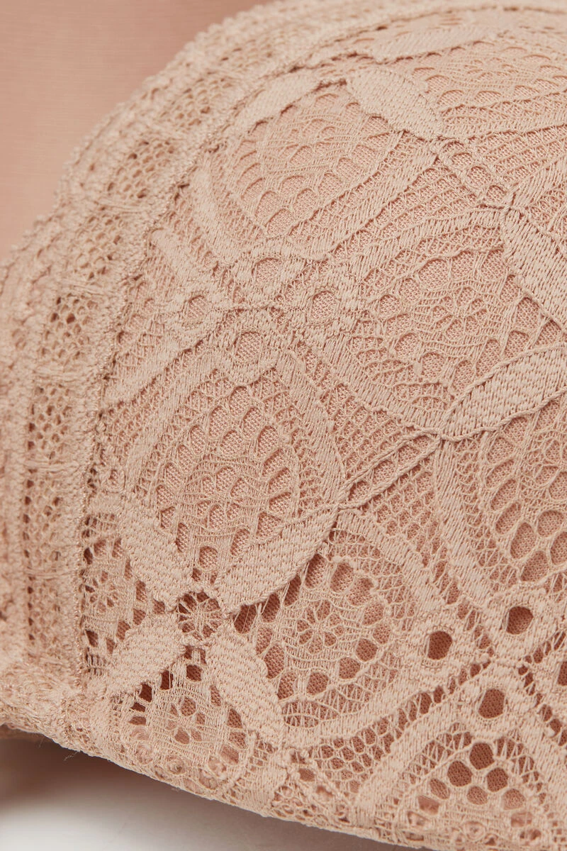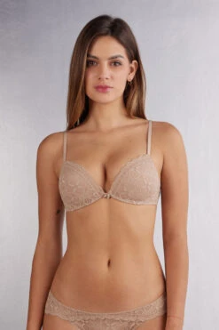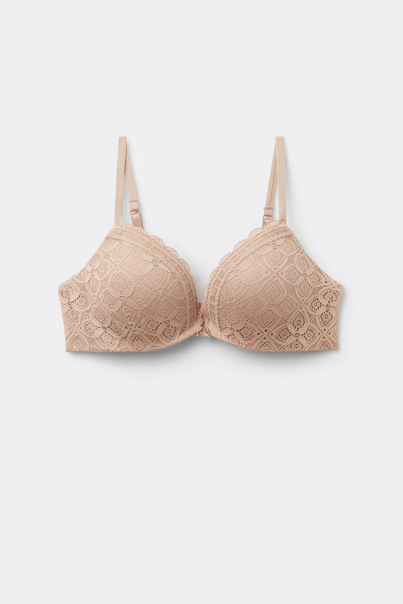 Soft stretch lace Silvia push-up bra with padded and graduated cups and no underwire. The soft padding in the cups creates a rounded finish to the bust with the effect of one size larger and the underband is double-layered in tulle for a better fit. The straps are covered in microfibre and are adjustable at the back. The lace has an on-trend, romantic allure defined by a geometric design embellished with frill. A lightweight, comfortable style that enhances the décolletage, crafted with seamless underband and cups.