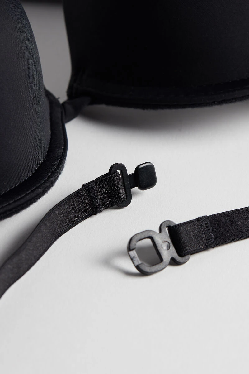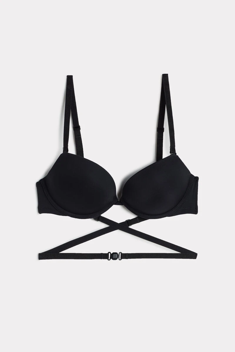 Silvia multifunction push-up bra in microfiber with soft cup bra padded and wired with inner cup in cotton. It can be worn with dresses with plunging necklines and special cross straps on the back. Great for women who want to enhance their natural cleavage with visibly more volume. Complete with a kit with interchangeable transparent straps.