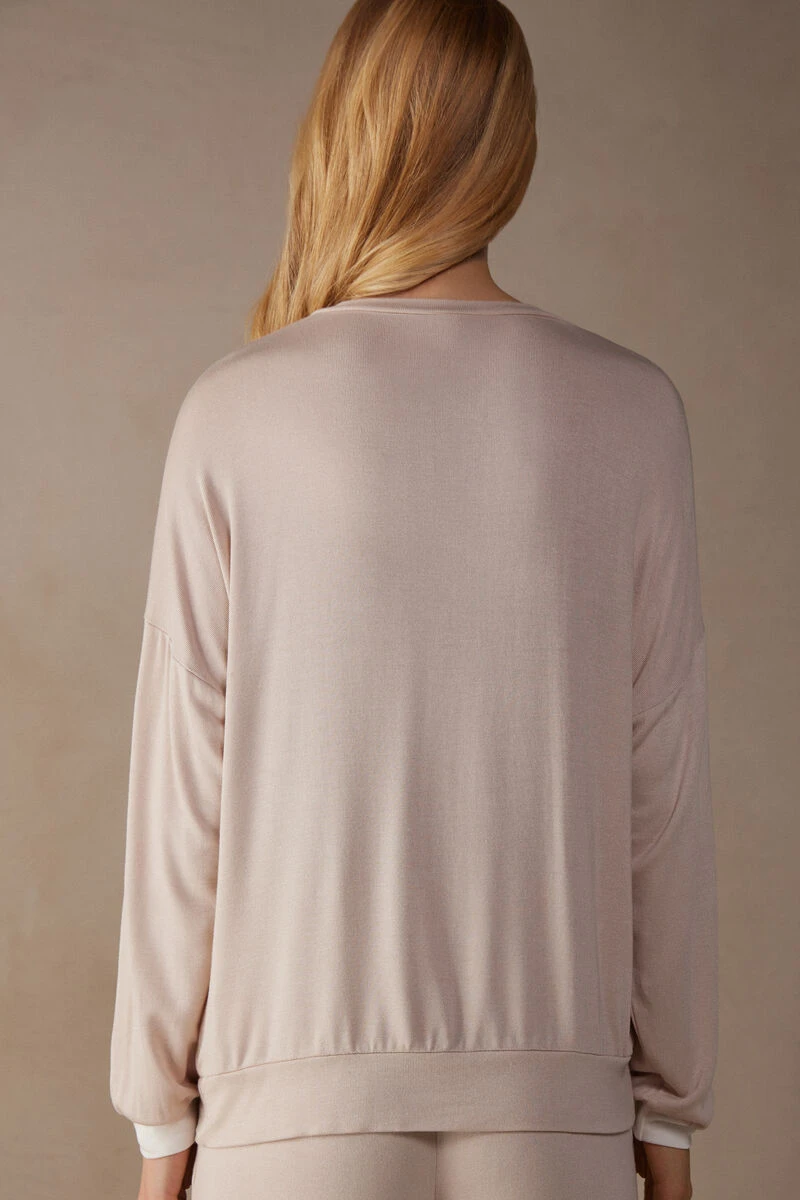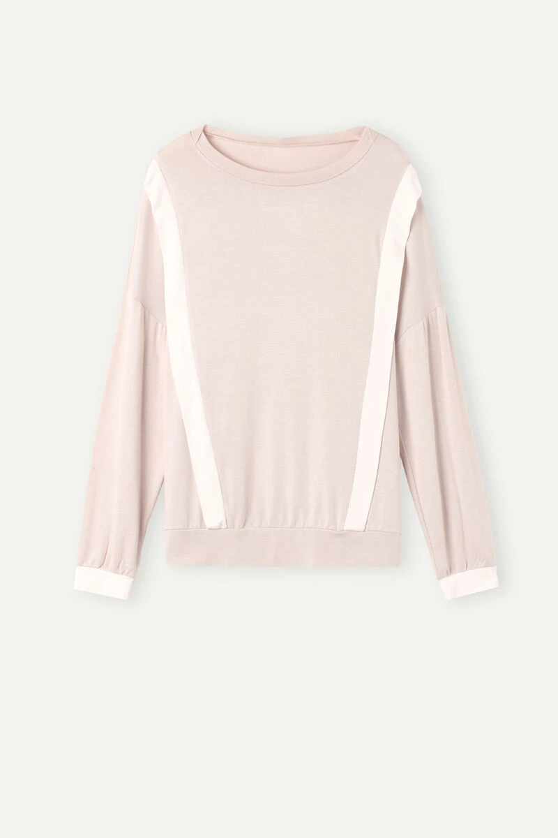 Boat-neck jumper in soft tricot-effect modal jersey. Cuffed kimono sleeves. Complete with front inserts and a contrasting coloured hem. Relaxed fit.