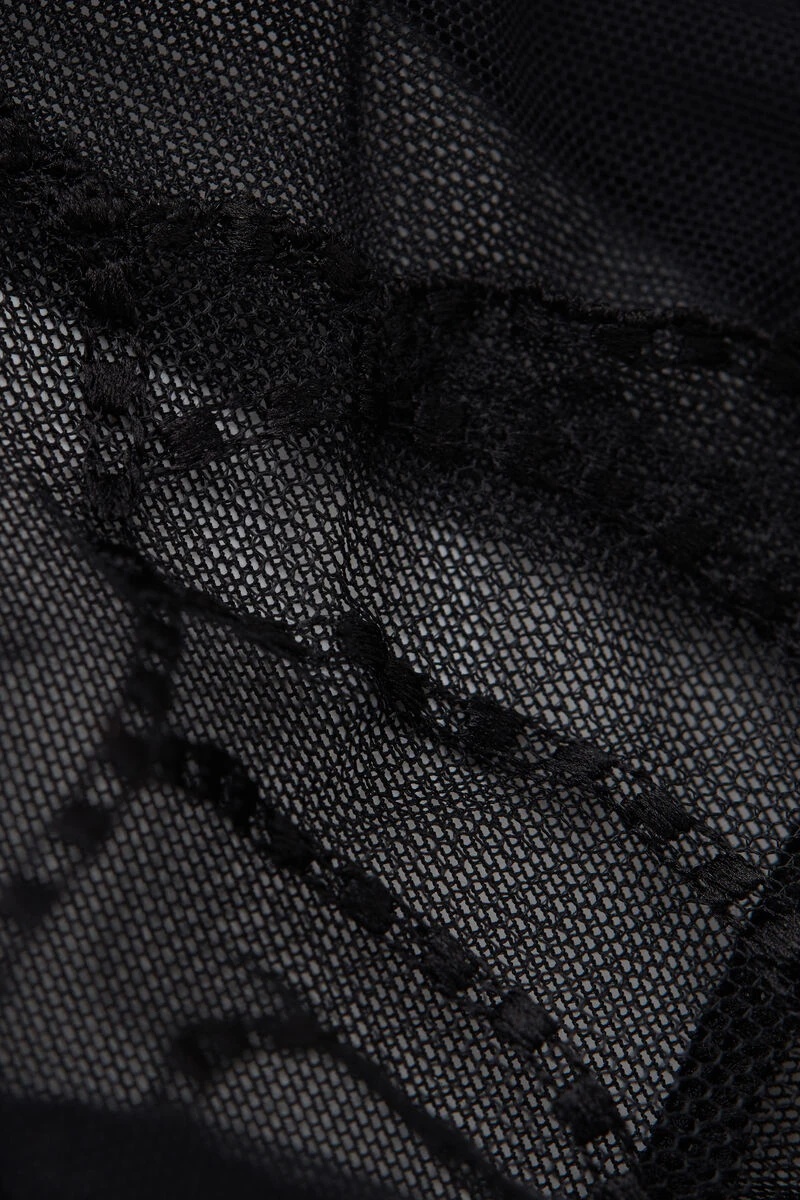 Stretch tulle Brazilian briefs with embroidered details and an elegant geometric motif. Complete with elastic cord to be worn around the waist. 100% cotton gusset.