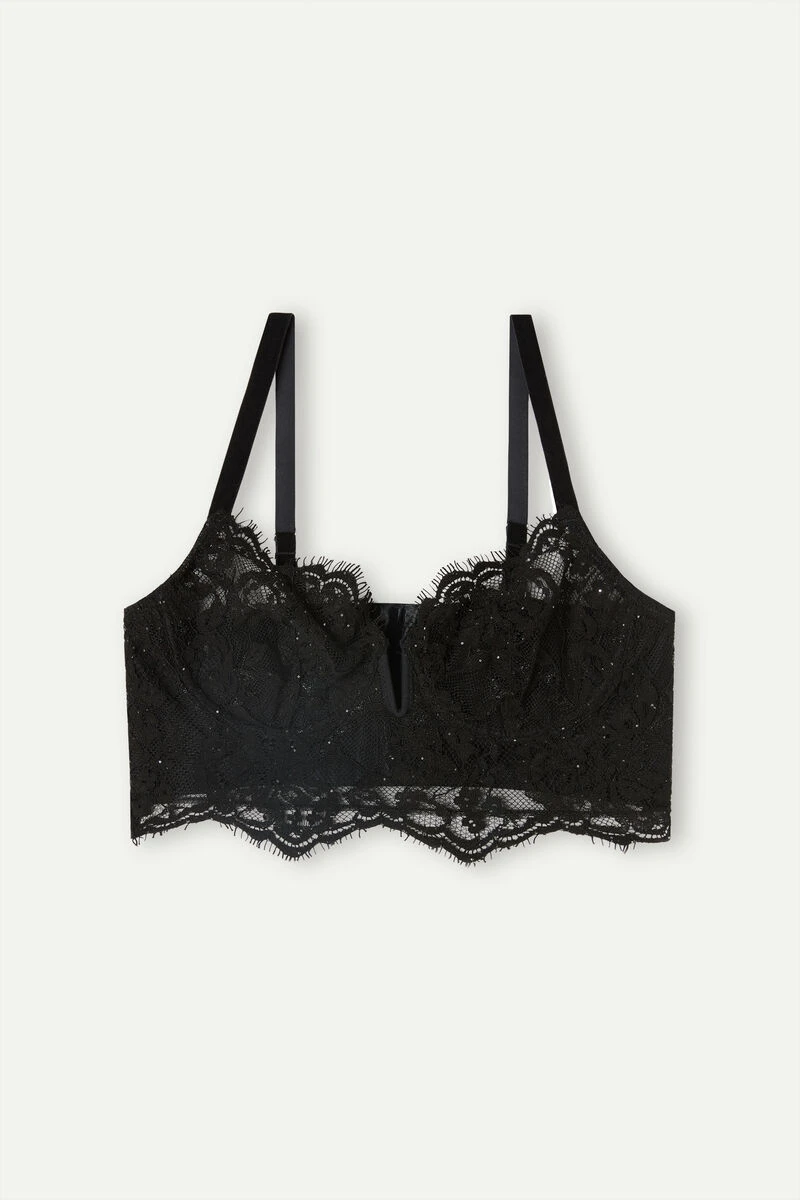 Daniela bustier with underwired balconette bra and boning at the sides. The cups are partially lined in double-layer tulle to provide more support to the bust. The style is crafted from lace embellished with micro sequins to create an elegant and refined sparkling effect. Features a V-shape in between the cups that highlights the décolletage. The back is made from flocked stretch tulle. Lined in tulle. Elegant and adjustable velvet-effect elasticated straps. An ideal design to wear peeping out from under a jacket or a transparent shirt.