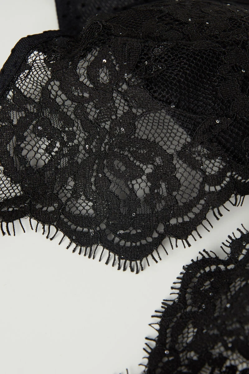 Elena balconette bra with underwire and semi-padded cups for soft support and a natural effect. The style is crafted from lace embellished with micro sequins to create an elegant and refined sparkling effect. The underband and trim are made from flocked stretch tulle. Elegant and adjustable velvet-effect elasticated straps. Romantic and feminine.
