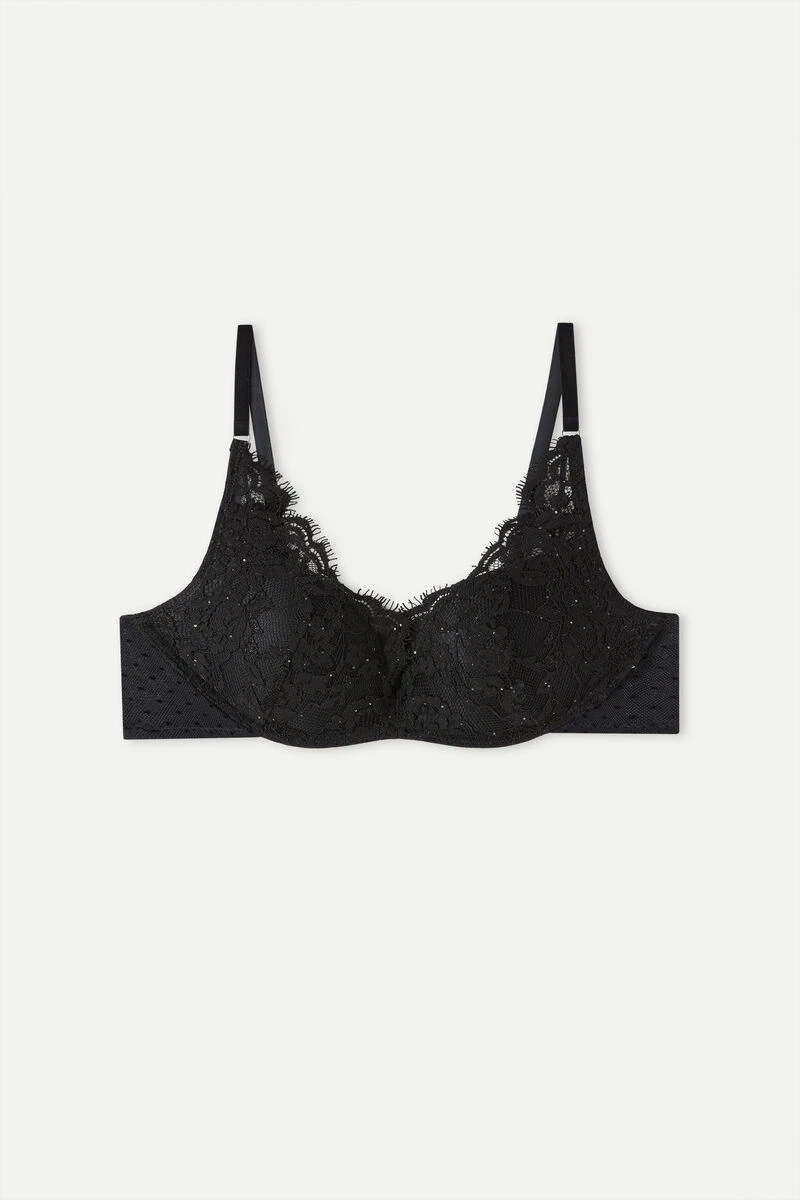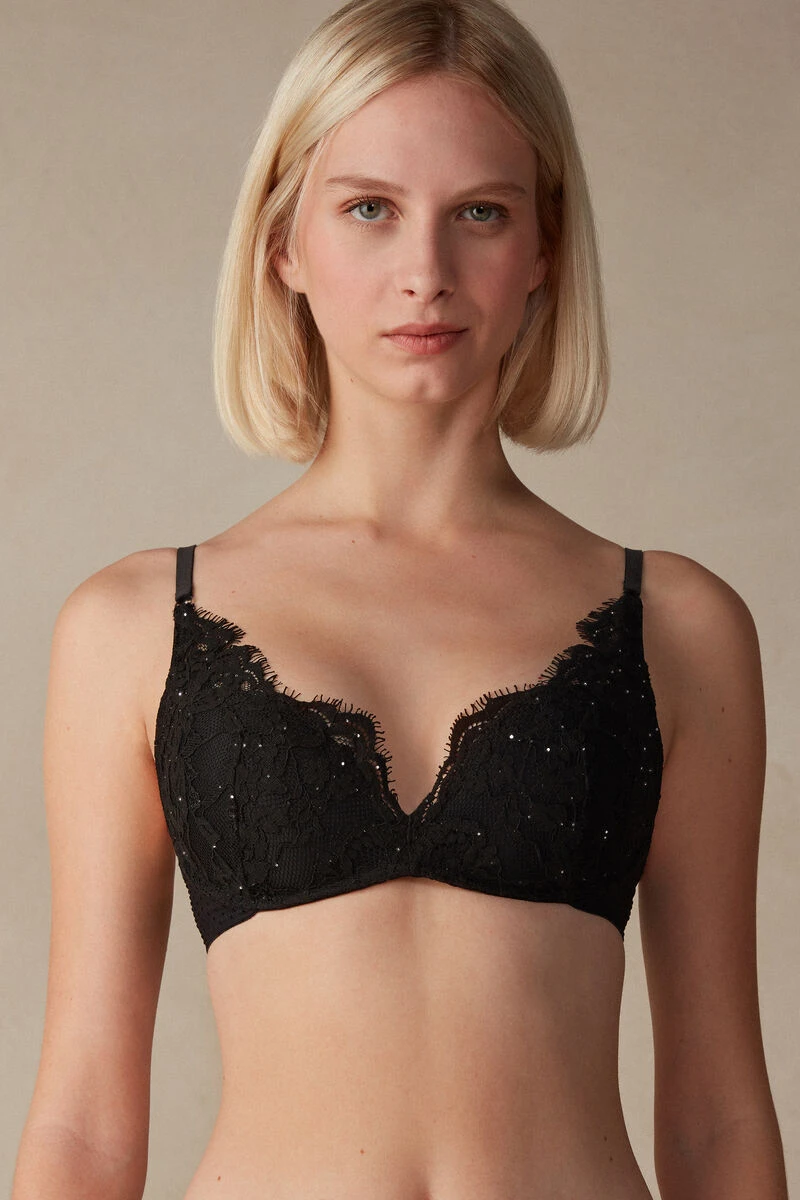 Non-wired Gioia super push-up bra with heavily padded moulded graduated cups. The style is crafted from lace embellished with micro sequins to create an elegant and refined sparkling effect. The underband and trim are made from flocked stretch tulle. Elegant and adjustable velvet-effect elasticated straps. The ideal style to create a voluminous finish with the effect of a bust two sizes larger and a striking décolletage.